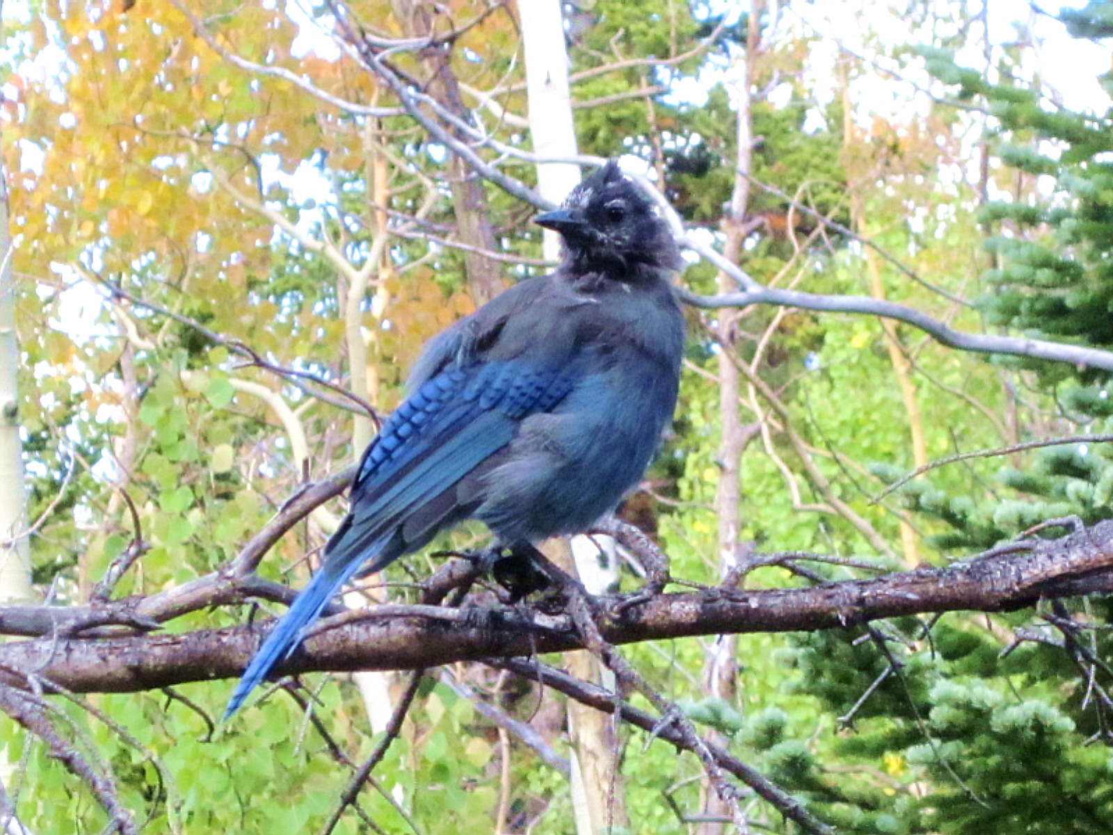 A Stellar-Jay sits on a branch near the trail (similar to a blue jay, but much larger).
