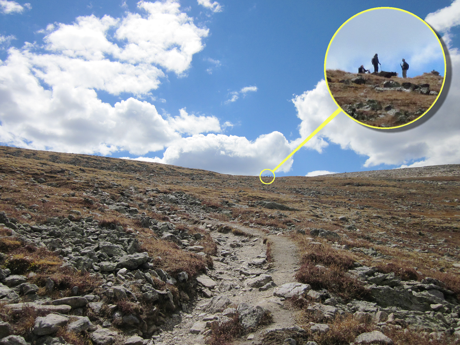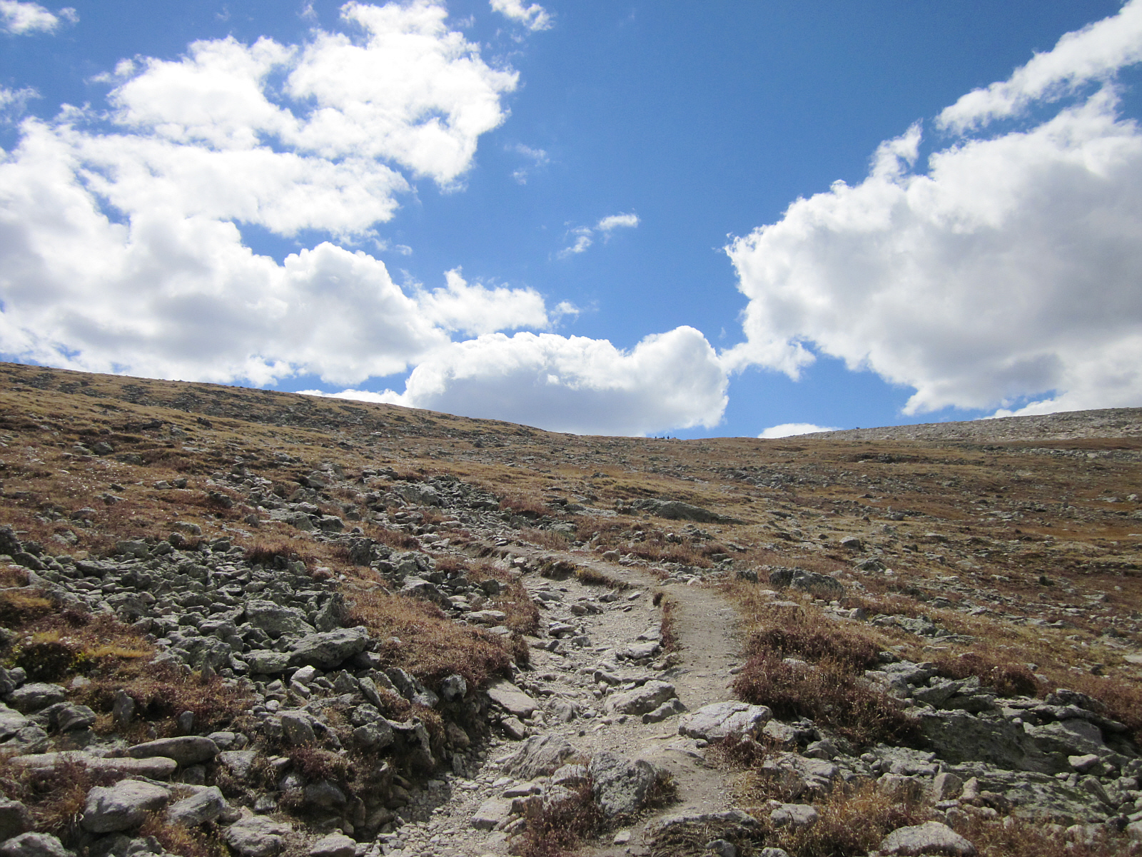 My legs feel sluggish and my energy has drained away in the thin, high-elevation air. This last section of trail seems to go on forever through the barren landscape & open frozen tundra. I slowly lift each heavy leg for another hour striving for the top, while stopping more and more frequently to gasp at the thin air every few steps. My strength is gone; but willpower drives me onwards (plus maybe some snacks & chocolate). I'm carrying plenty of water, but the intense sun and dry cold wind parches my face & skin. Flattop Mountain is true to its name, and is flat on top; where I can see other hikers. I summon my last remaining strength and head towards them. < Can't see them? Click the photo for help >.