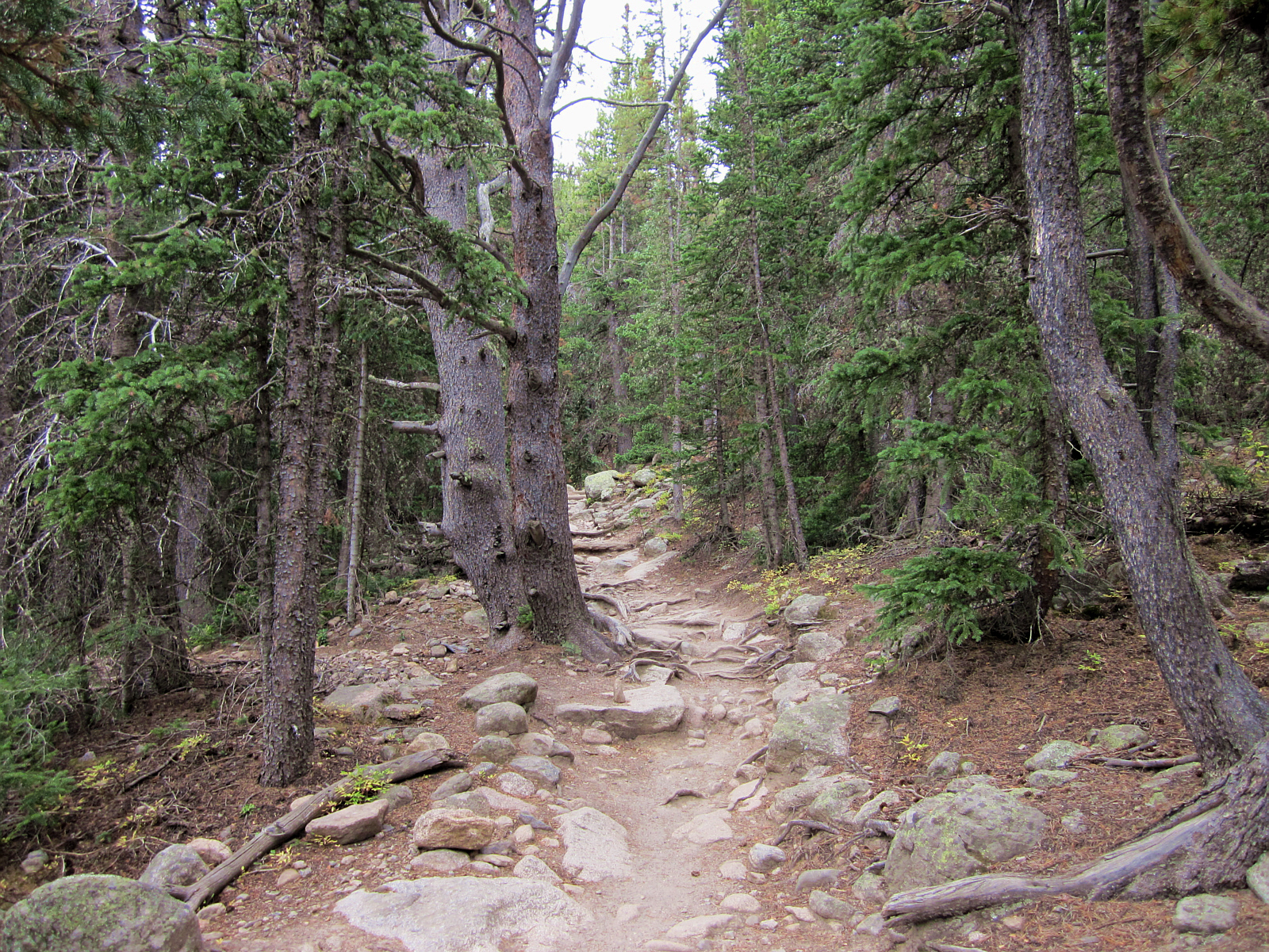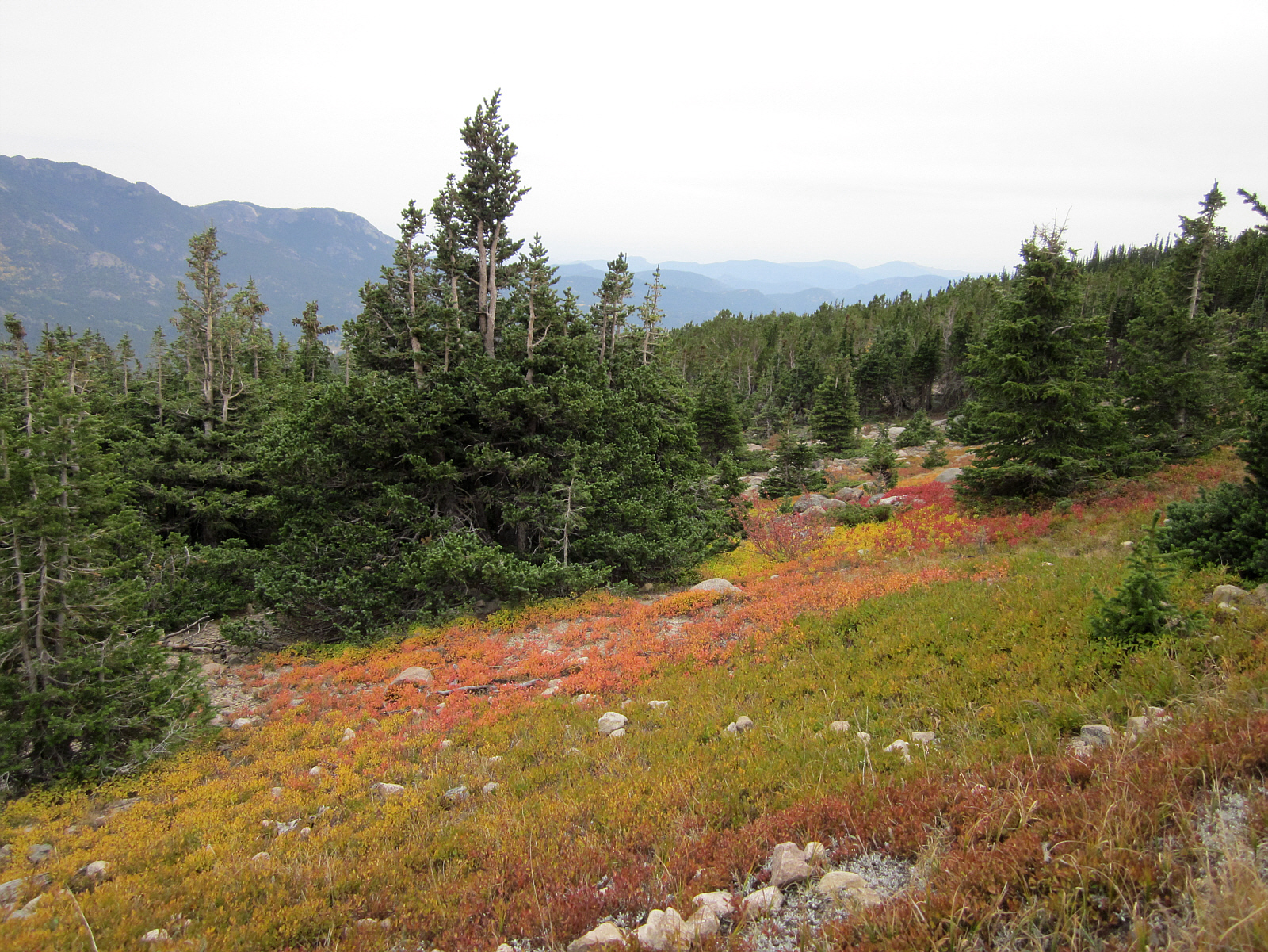 After about 2 hours of hiking, this trail approaches the 11,500 foot Alpine Zone -- and trees begin to get shorter. The Evergreen Pines never change color, but short shrubs and grasses provide a nice Fall Foliage display.