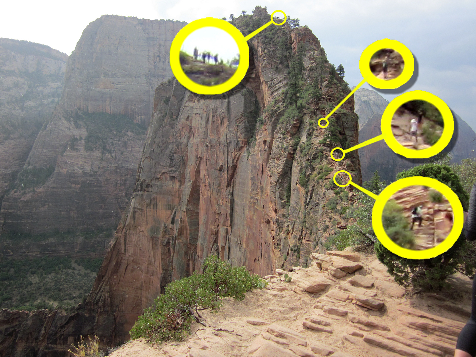 Angel's Landing awaits at the top of this high peak. This last section has more chains to help, as I follow other hikers ahead on the trail. See them?