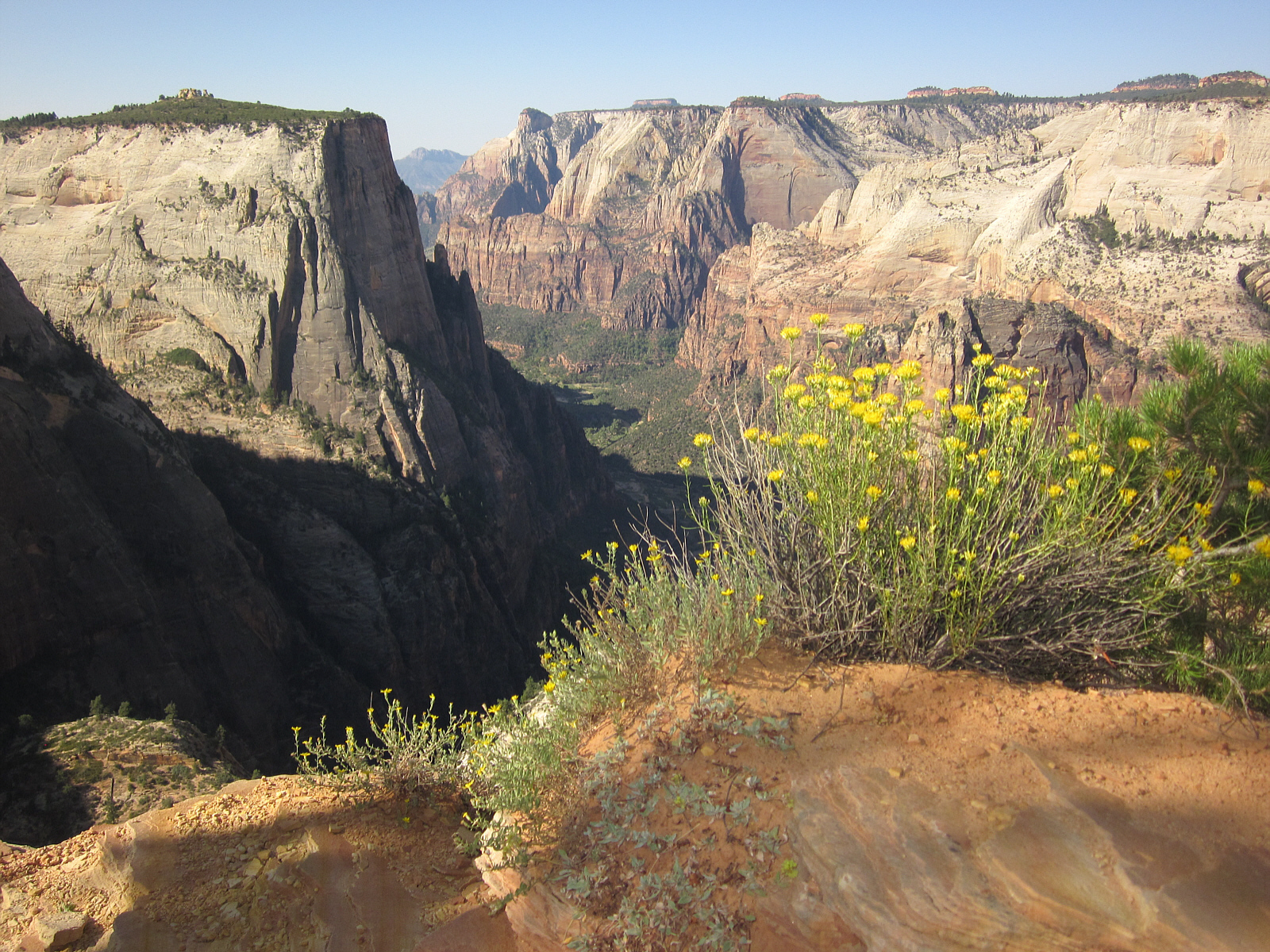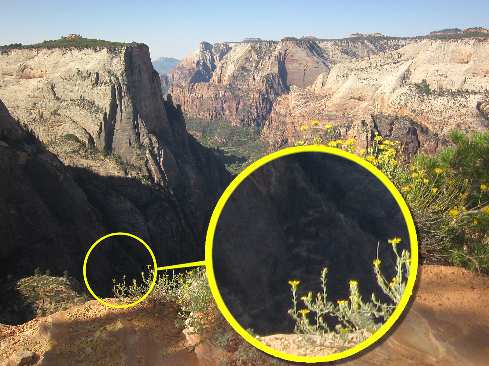 Gaining elevation during the climb, I can see the valley below (where the hike started), and if you look closely in the shadows of the mountain, you can see the zig-zag trails coming up.