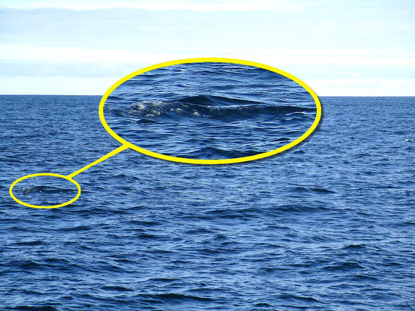 On the open water we look for whales, dolphins & other animals -- but finding them in the vast sea is like an aquatic "Where's Waldo". The tour guide calls out directions -- and we'll sometimes catch a quick glimpse of a dolphin or whale splashing briefly at the surface before returning below (somewhat typical for whale watching trips - but still fun). I squint at the waves while the guide calls out "Fin Whale" and points. See him? Click the picture for an expanded view.