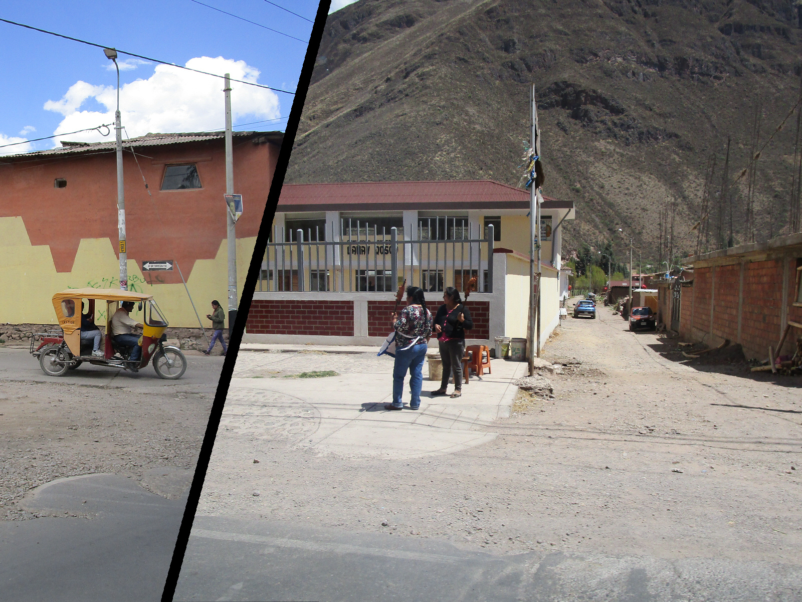 Driving through the small local towns, most people get around in Tuk Tuks -- a practical 3 wheel vehicle common here. These towns typically have a paved 'main' street with dirt roads for side streets. Locals sell roasted or fried guinea pigs on a stick on the street corners (a popular food here) -- and makeshift 'bars' called chicherias sell a traditional home brewed 'beer', often in the front room of someone's home. The houses selling the chicha beer are marked only by a broomstick with a red bag or balloon at the top (look down the side street, or click the picture for an enhanced view).