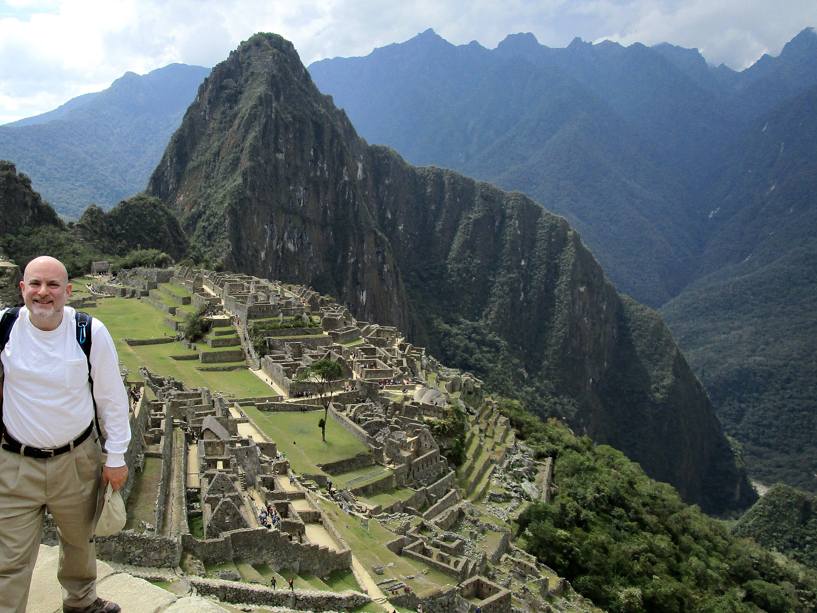 I hand my camera to Edwin and stand as close to the edge as comfortable (or maybe a bit closer) for this photo. The Inca never developed a written language (or the wheel), but their ability to shape the landscape was remarkable, and signs of their work are everywhere. Even at the highest peak behind me, you can see the remains of more buildings and terraces (click photo for help viewing).