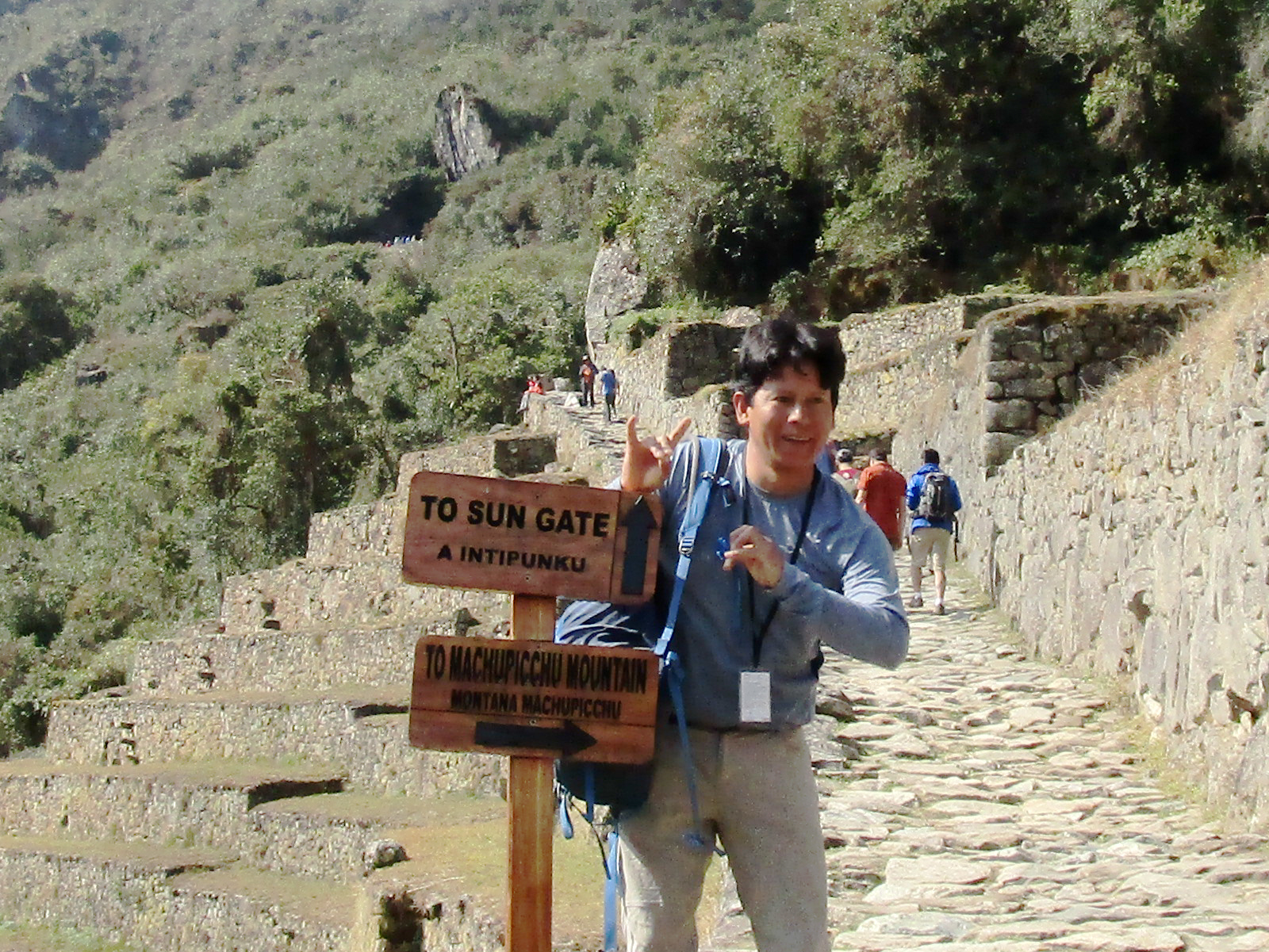 Back at Machu Picchu -- but today this is just our starting point, as we'll hike another 2000 feet up (from 8000 to above 10,000 feet). Permits are required for these hikes, and there isn't time to see them all -- so we select Machu Picchu Mountain (our permit gives us an 8a-12p window for this). Edwin arranges our permits, teaches us a few Quechua words and shows us how to make a llama with your fingers as we start upwards.