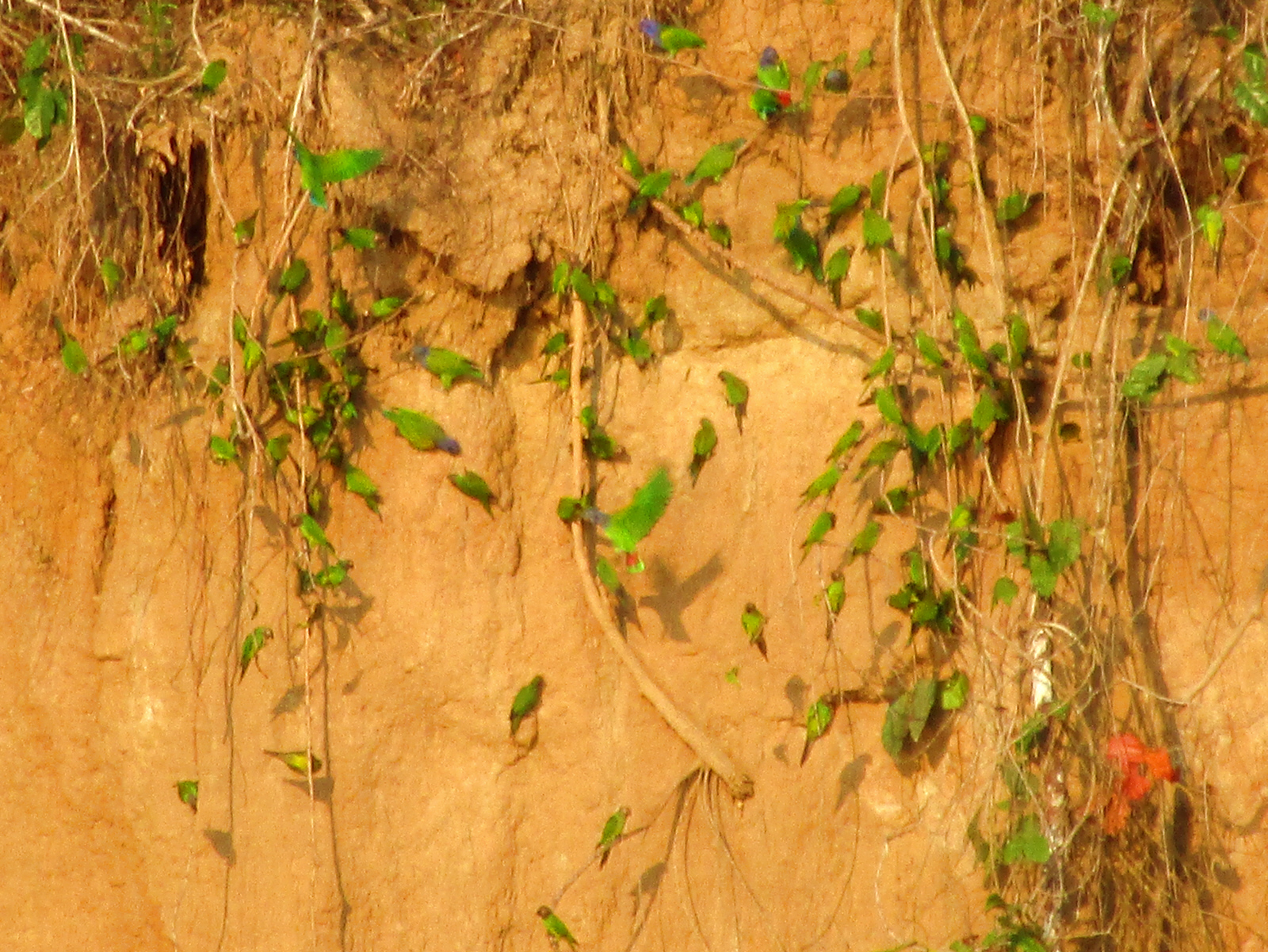 It's 8am as we return upriver from parrot watching. Our guides constantly watch the shoreline, slowing the boat anytime there's an animal sighting. "Look, a sloth" he says, pointing (it's amazing how he sees this -- center of photo). We can't see it's face (or toes), but based on his colors, we think he's a 3-toed sloth (compared to yesterday's 2-toed sloth, which is nocturnal & more active at night -- although 'active' is maybe the wrong word). Click photo to zoom in.