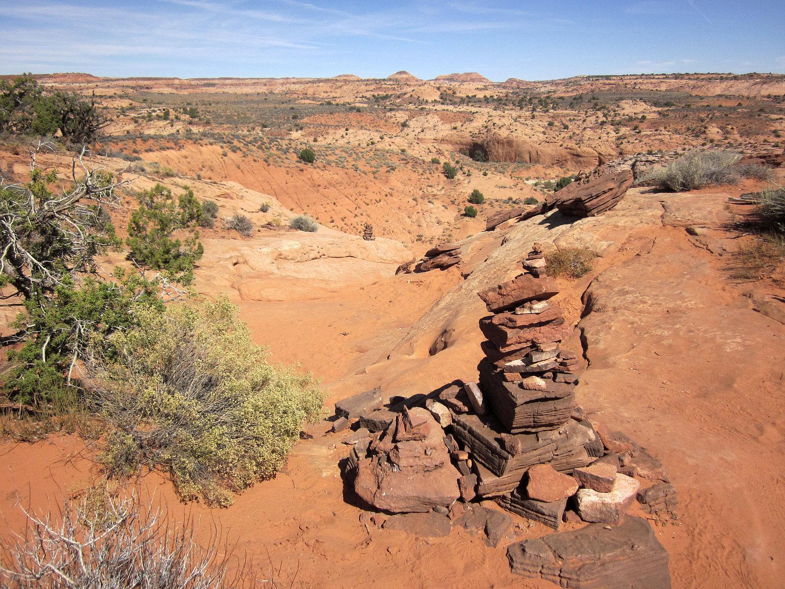 This is especially helpful considering how easy it could be to get hopelessly lost in the vast terrain. As pictured, it's common for cairns to be spaced so that two or more are always in view -- showing a path that might otherwise be invisible in this dry desert. Elsewhere, cairns might be farther apart, and a 'nose' (stone jutting out in one direction from the rest of the cairn) points the direction of the trail. |