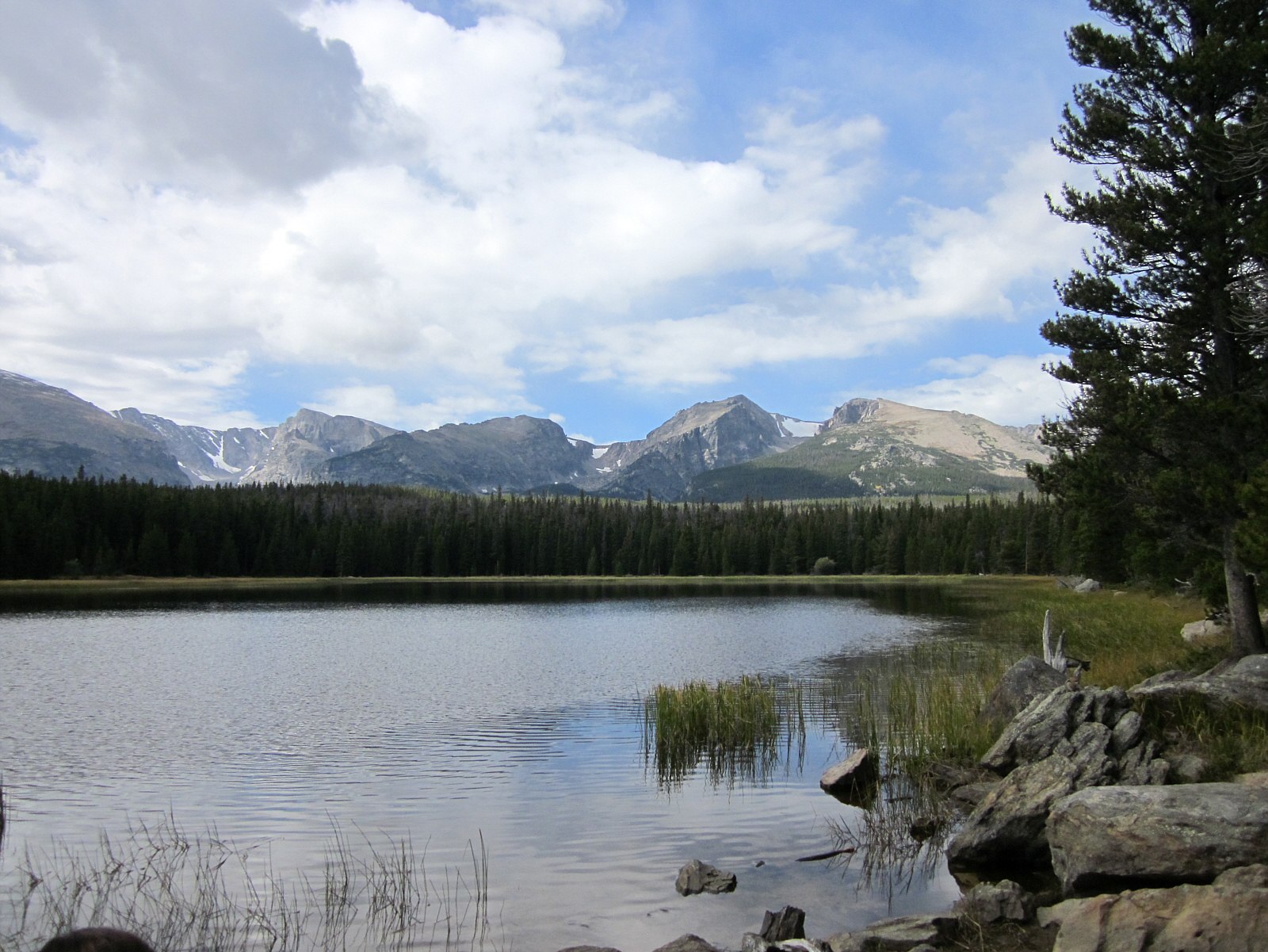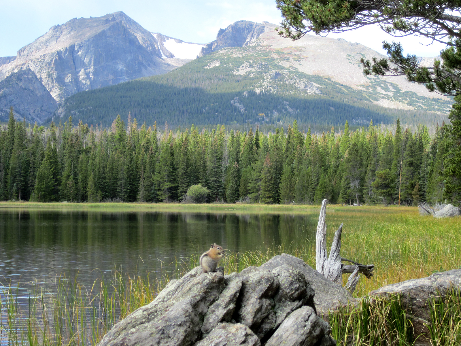 The air is fresh and clean with a fragrance of pine and sagebrush up at Bierstadt Lake (pictured).