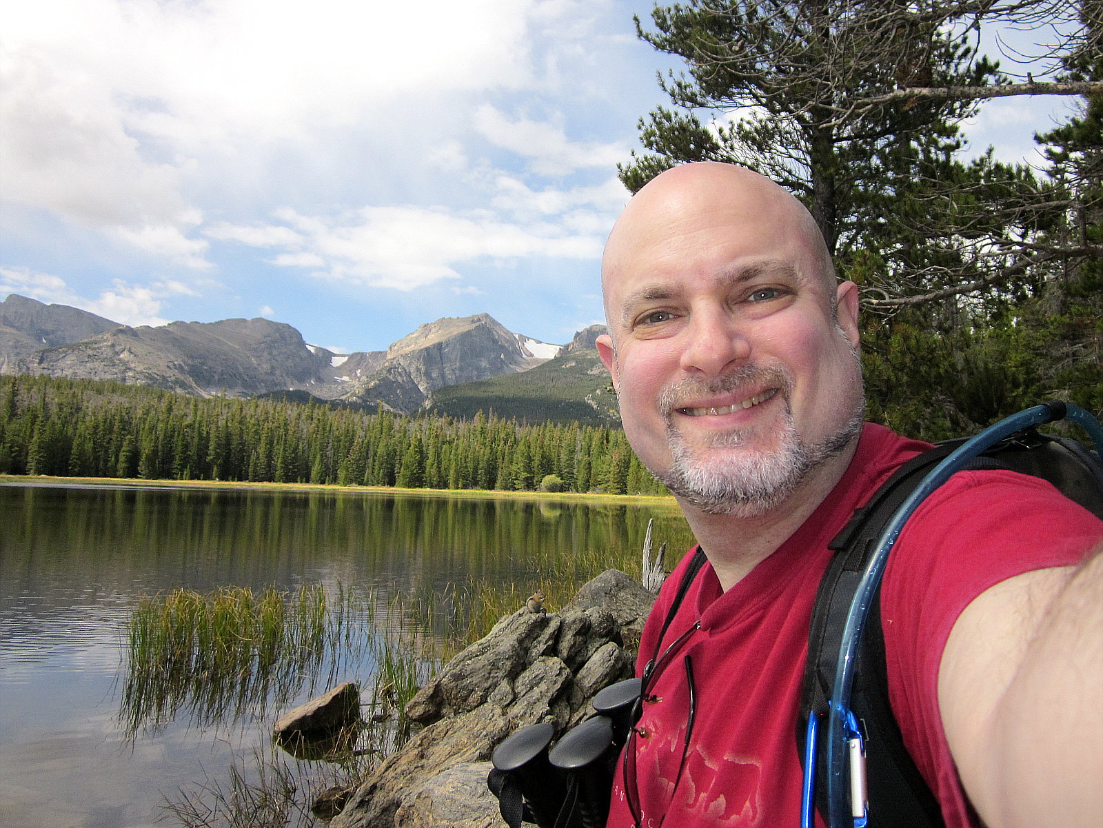 Dan, chipmunk, Bierstadt Lake and mountains (self-portrait). The scenery here is stunning.