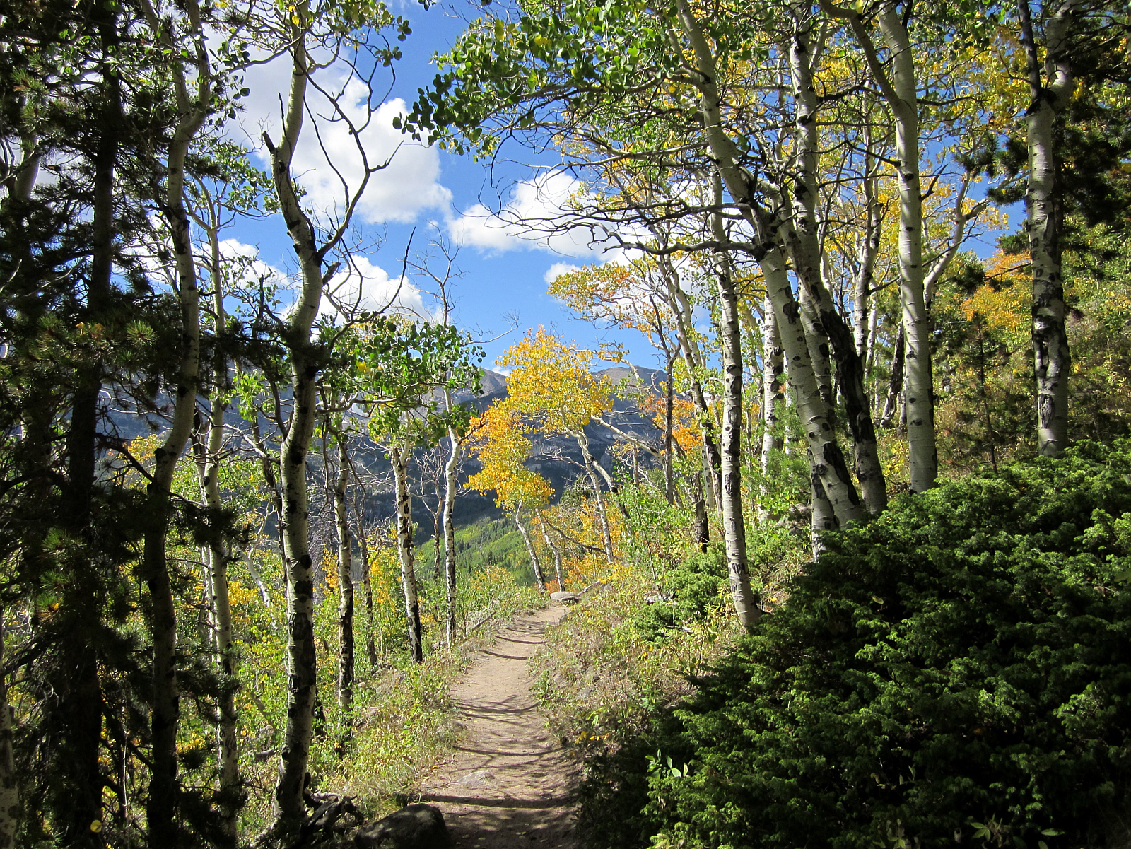 Leaving the lake behind, the trail passes through wooded areas with changing Autumn colors.
