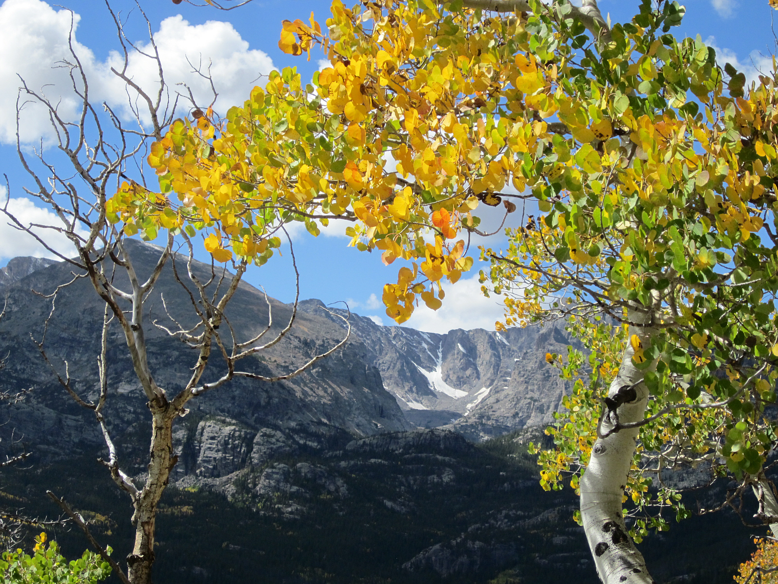 Looking through the trees to the distant mountains, I see many small glaciers. These never melt (even in summer) -- but have been shrinking since the last ice age, and may eventually disappear completely.