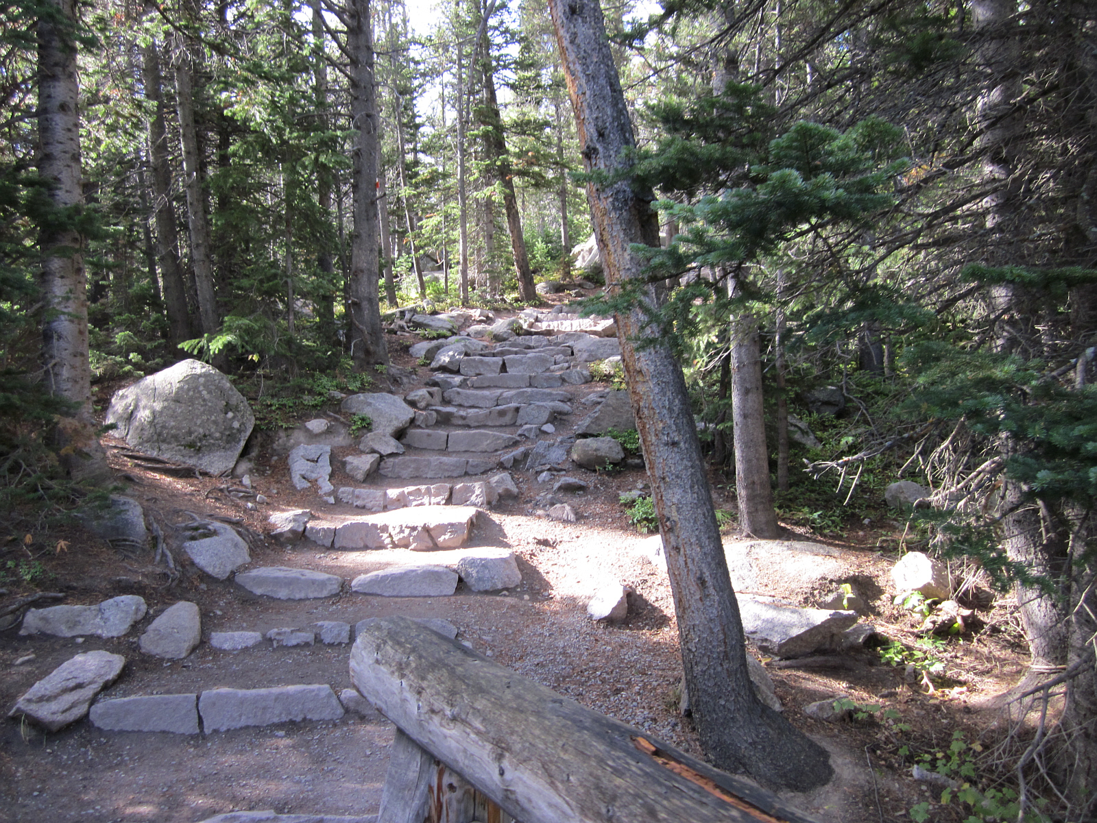 Sept 14; It's a nice, cooler day today -- perfect for a big hike. I choose Black Lake; about 10 miles and 1400+ foot elevation gain, starting from the Glacier Gorge area of the park (near Bear Lake). This trail wastes no time in starting the climb up through a fragrant pine forest. I inhale deeply and begin the ascent.