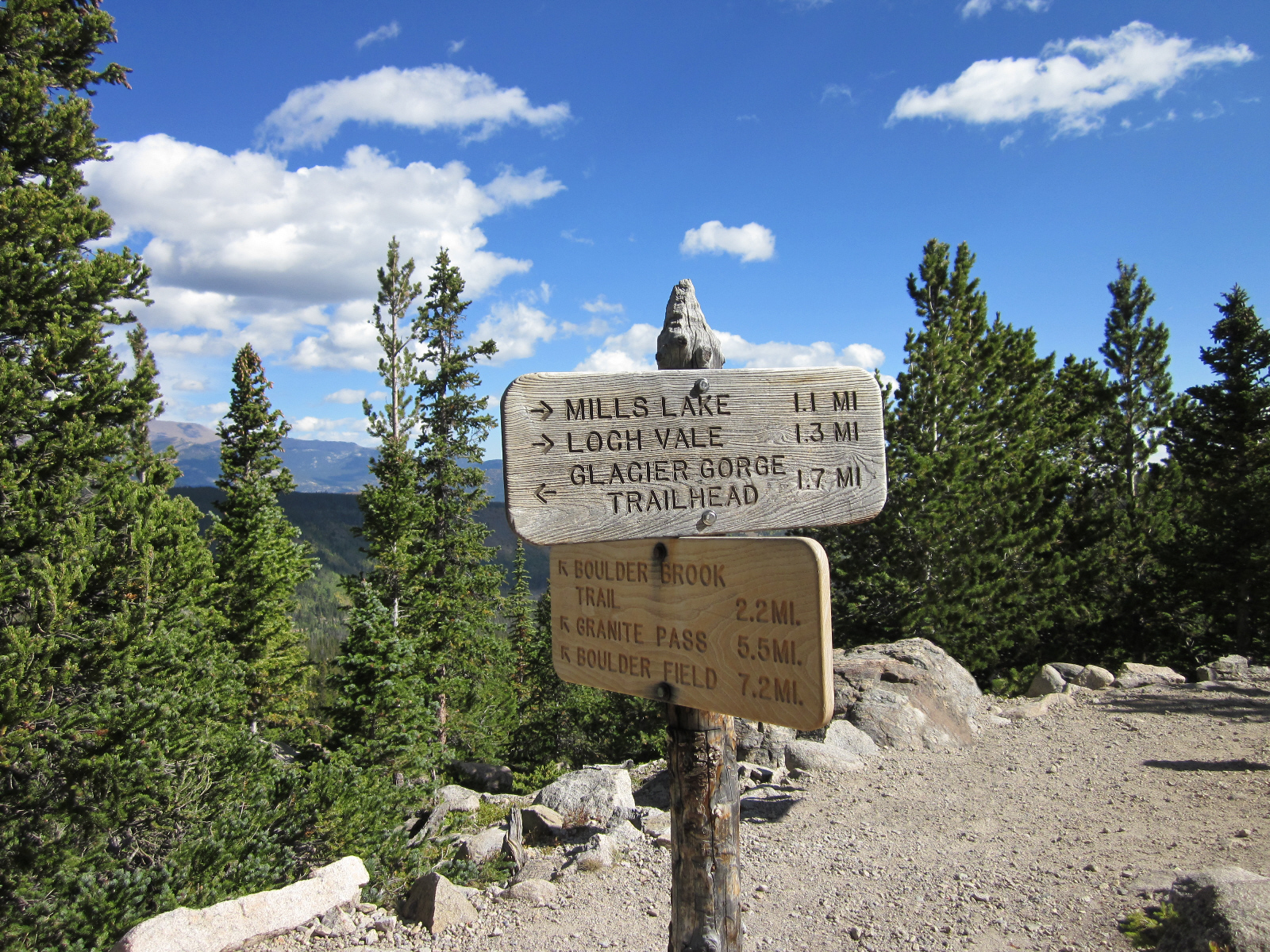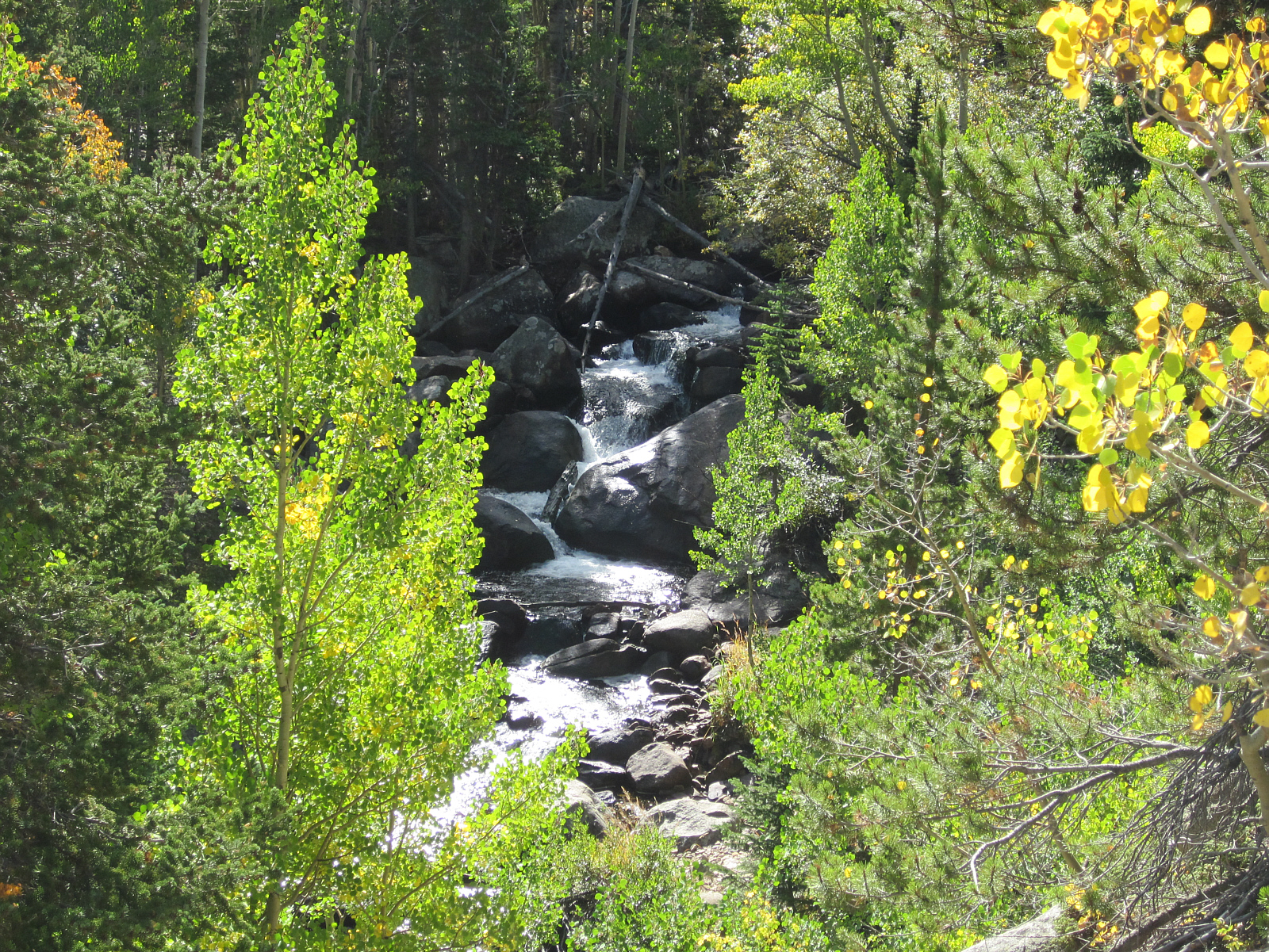 A popular and well-documented hike to Sky Pond leads in one direction, tempting me to visit -- but I've chosen a different destination to the lesser-known and more secluded Black Lake via a different path. I may never be at this intersection again in my lifetime -- and I can't help but wonder about the trails left behind. But the natural beauty of this entire area makes me confident there are really no 'bad' choices as I resume the hike. |