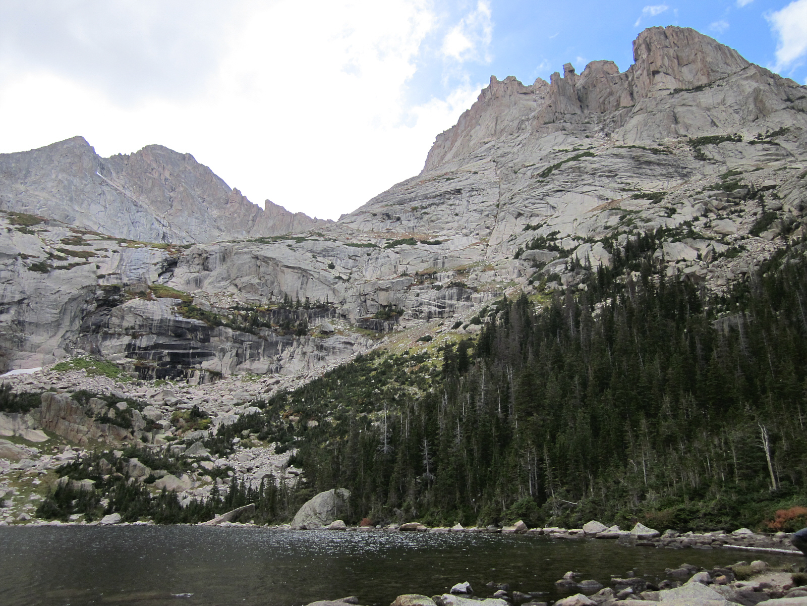One last steep climb to the top to reach Black Lake (pictured). With steep rock walls surrounding it, this lake was probably formed by glaciers thousands of years ago. This was a challenging accomplishment -- having hiked up to 10,600 feet from the start (more than a 1400' elevation gain). I still have to hike back down, so I relax for a while, but don't stay too long.