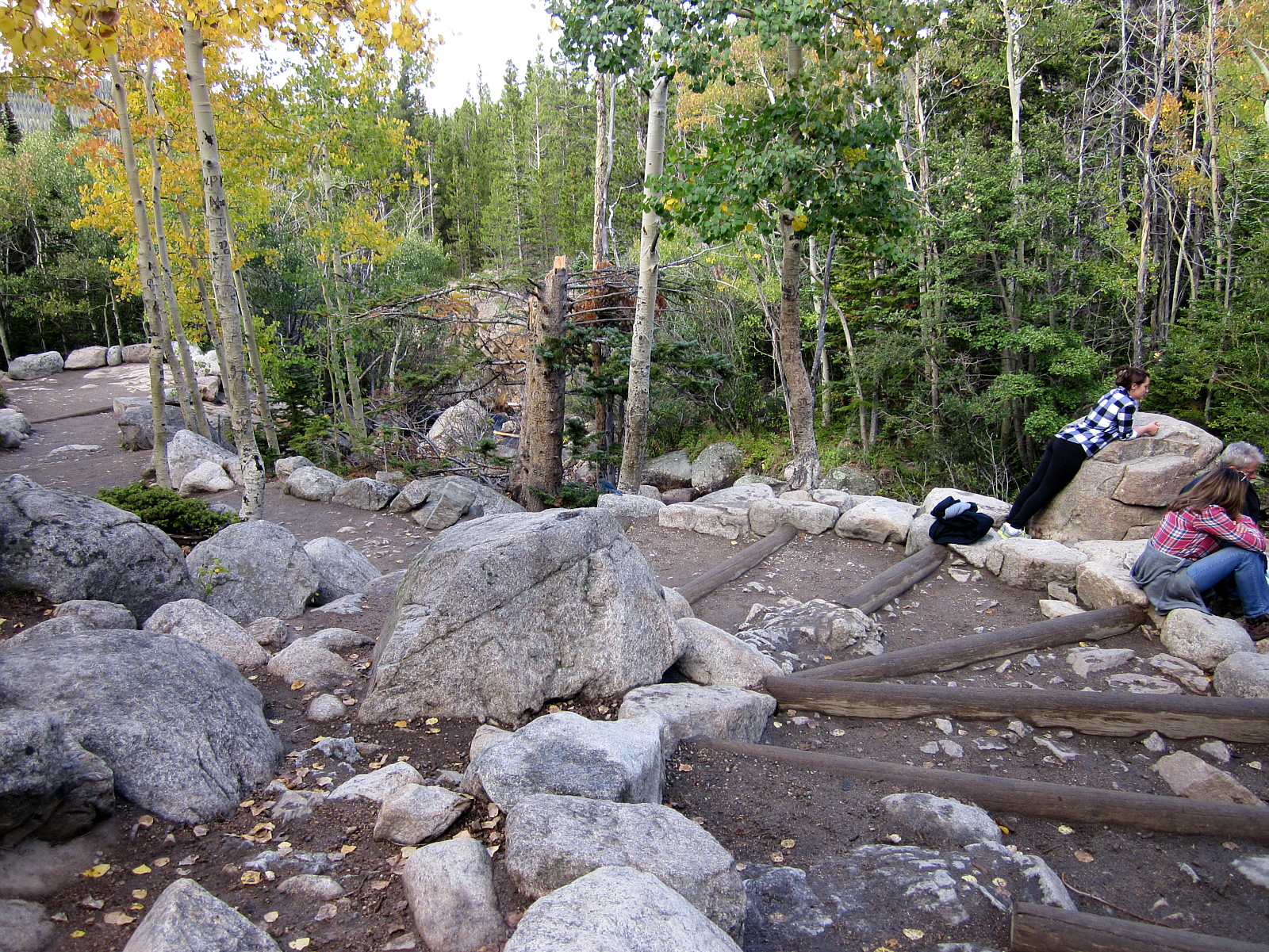 I take one last picture and head down the stairs on this section of the trail, where other hikers are admiring the stream. Hiking down is sometimes more challenging than up, so I put the camera away to concentrate on the return trip & footing. Clouds roll in and pelt me with hail for 5 minutes before clearing up again -- but otherwise nice weather the rest of the day.