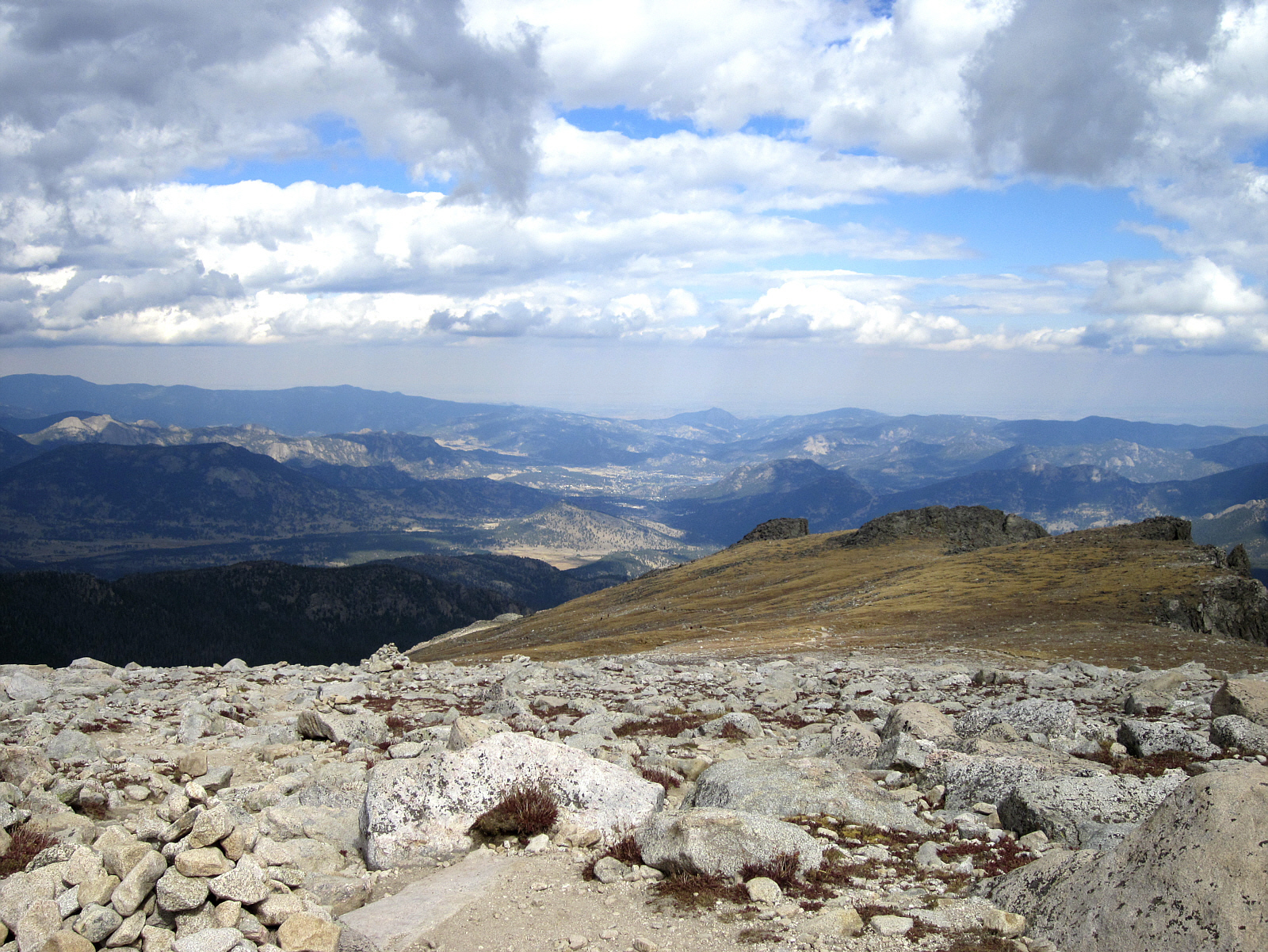 Looking down at the trail ahead, it's still a long hike back even to reach the tree-line (not visible here). Surprisingly, I met quite a few other hikers on this ultra-strenuous, but popular hike. Looking across the tundra, I see the trail and several of the others hikers ahead; helping to show the immense scale of this landscape.