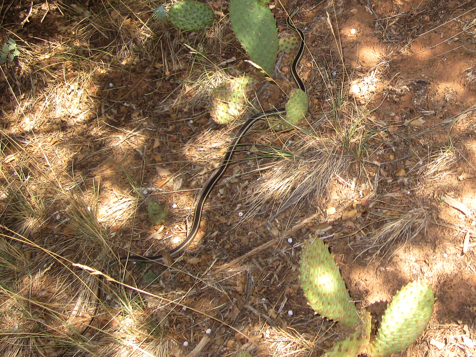 Nearby, a very long skinny snake slides quietly past me on a shady area of trail, perhaps looking for chipmunks or other prey.