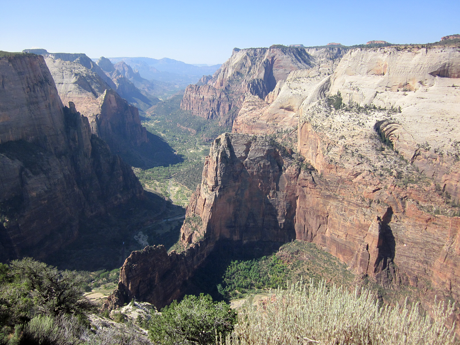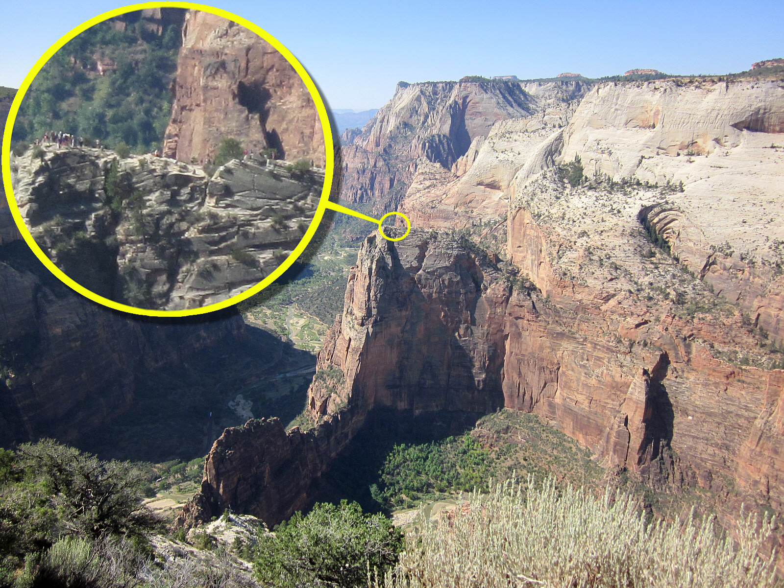 Observation Point -- the top of the trail at 6500 feet. This 8-mile hike (round-trip) gained 2150 feet of elevation to get here. This is a good place to relax with other hikers and enjoy the rewarding view of the valley, mountains, and Angel's Landing (where I hiked the first day -- see it?).