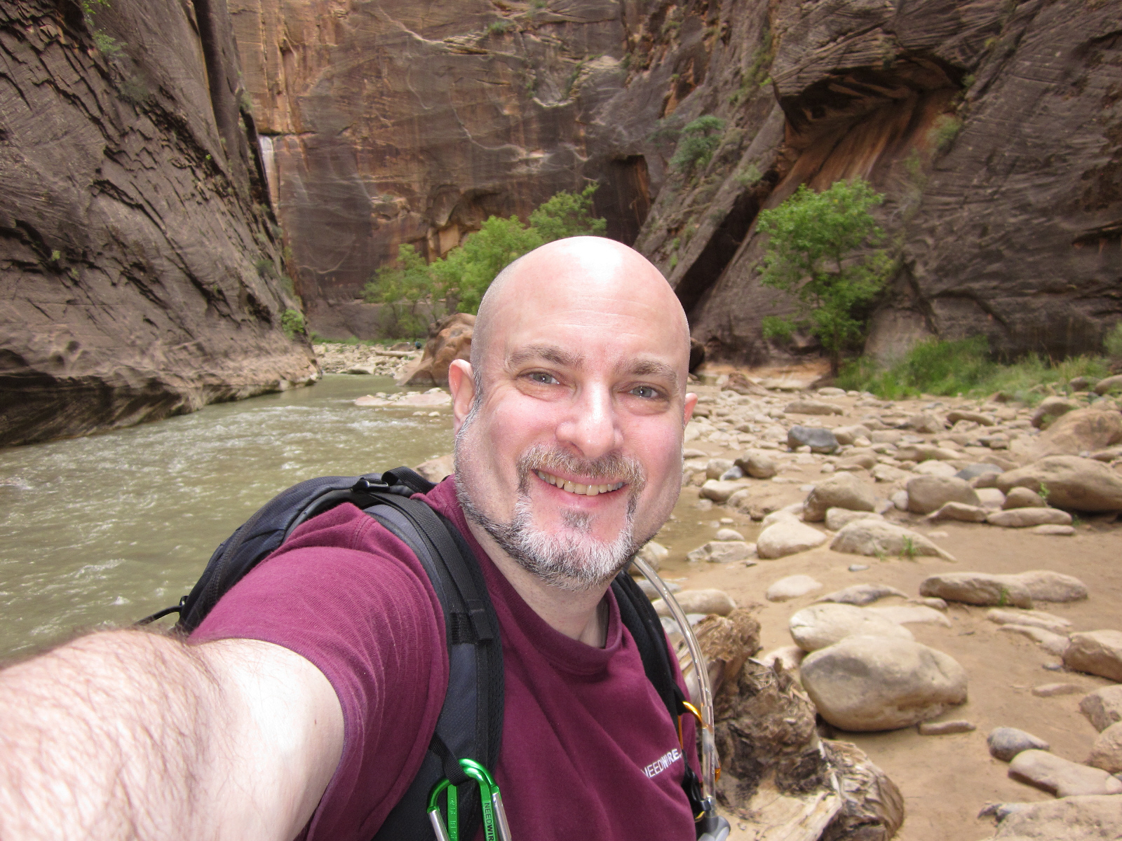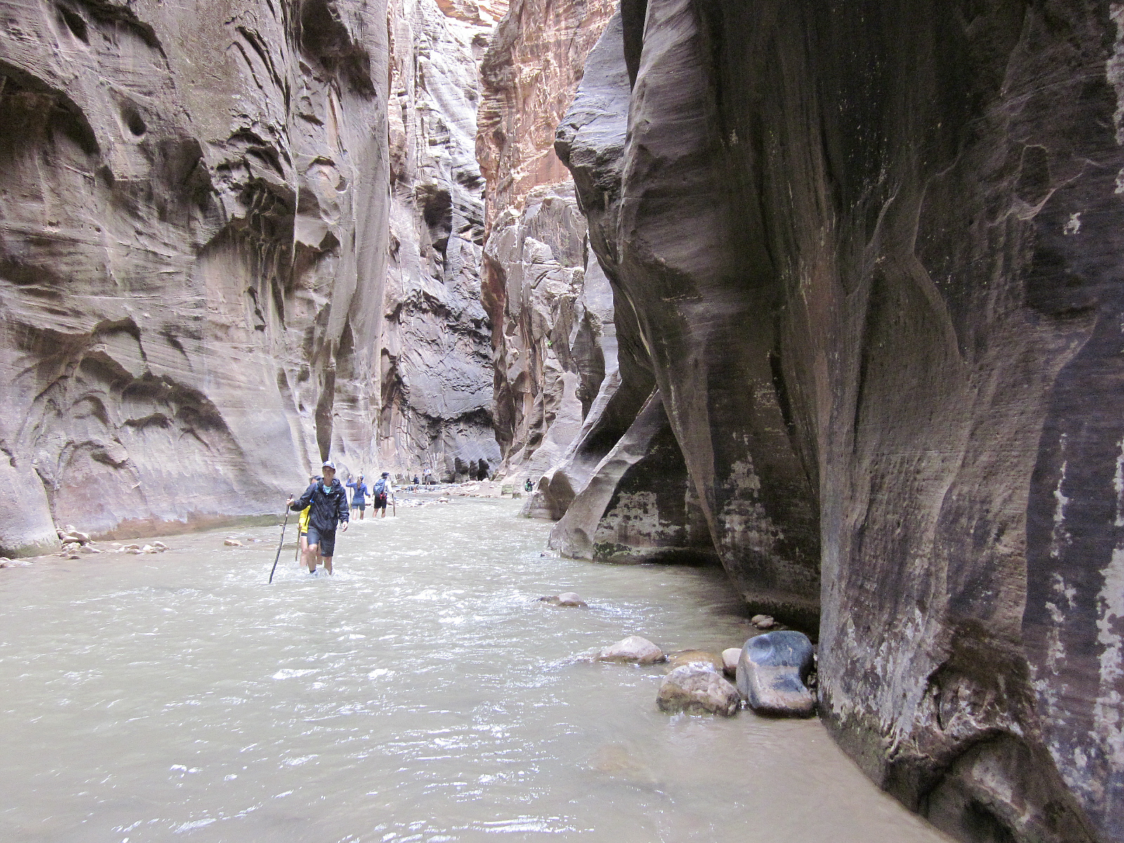 The water gets deeper in narrow sections like this, where this river has carved a deep channel in the sandstone cliffs over millions of years. Some hikers coming from the other direction say that it gets neck-deep in some areas -- but I didn't travel that far.