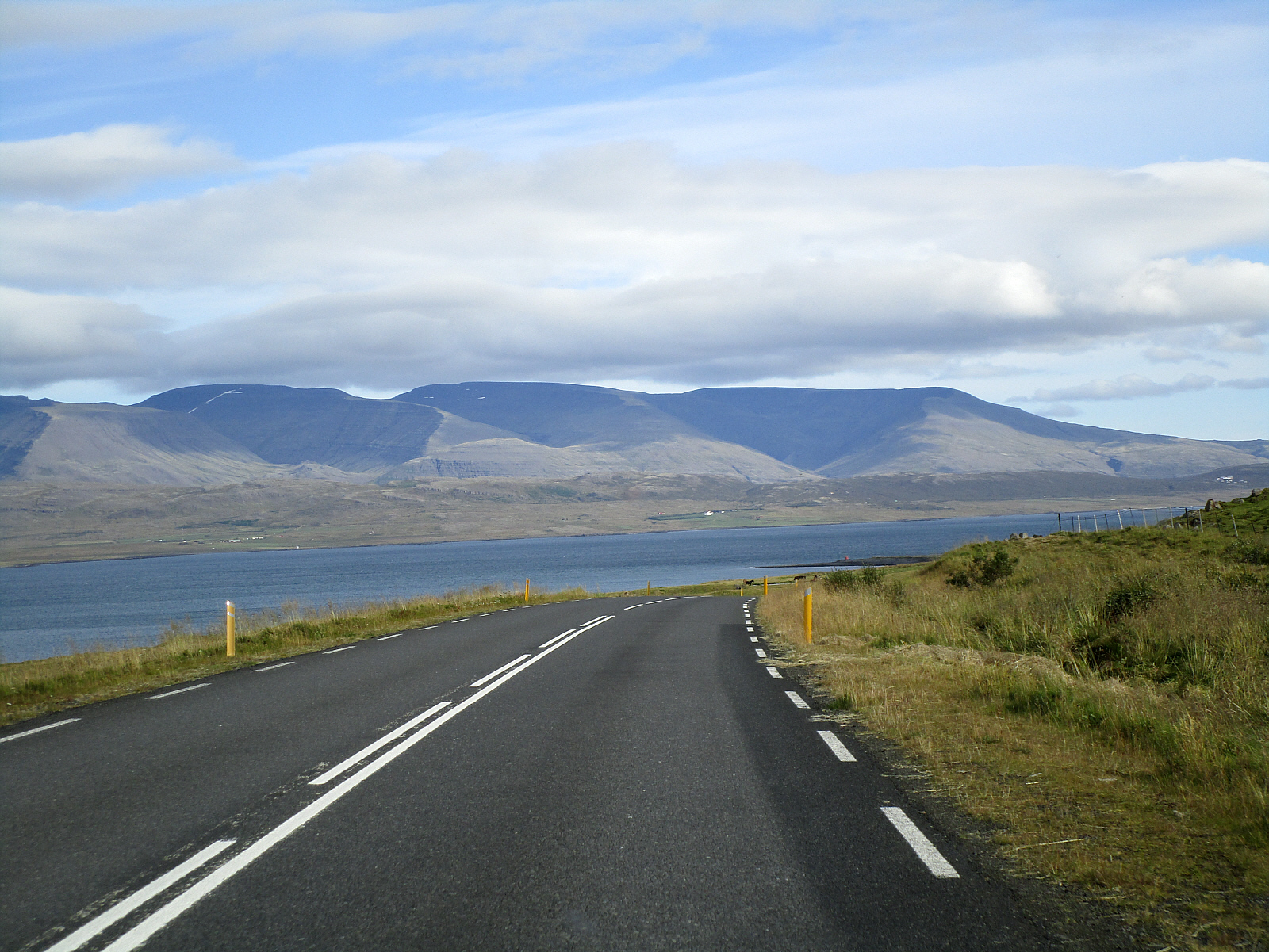 It's a nice day for a drive as the road passes over a small bridge. There are many streams and rivers here, possibly meltwater from glaciers higher up, or maybe from all the rain they have here.