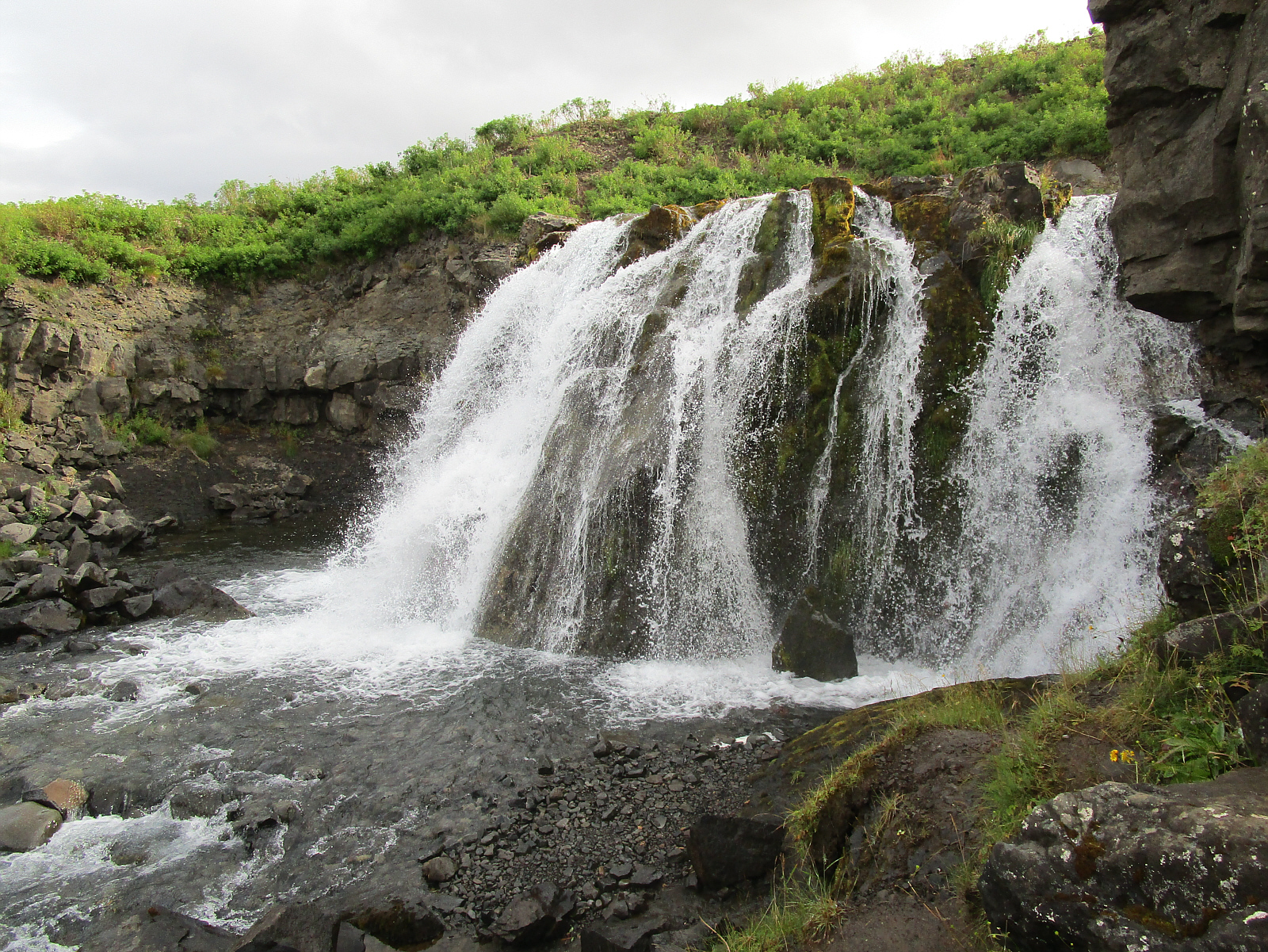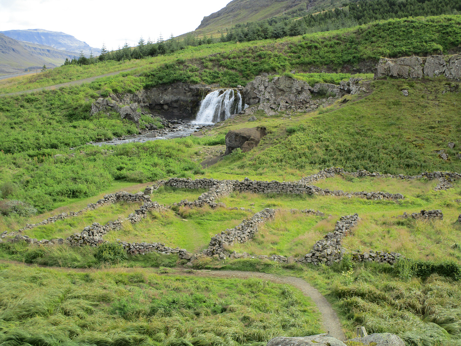 ![]() I notice a waterfall near the side of the road with very little information other than a sign that says "Fossárrétt". Several unmarked trails lead up into the hills, and I can clearly see the remains of an ancient building that might be 800 years old (or more). There is nothing to provide any additional information other than what's seen, but it's a nice place to stretch legs, enjoy the waterfall and even hike a little bit up one of the unmarked trails.