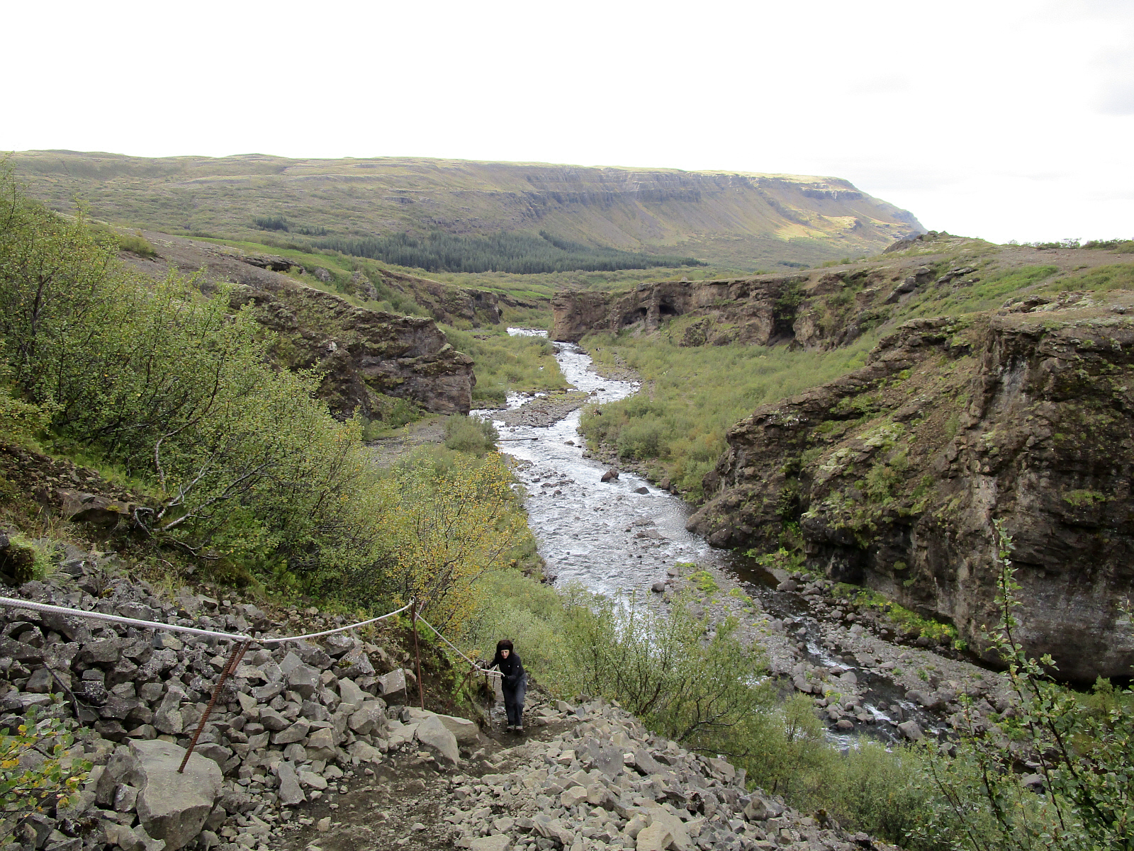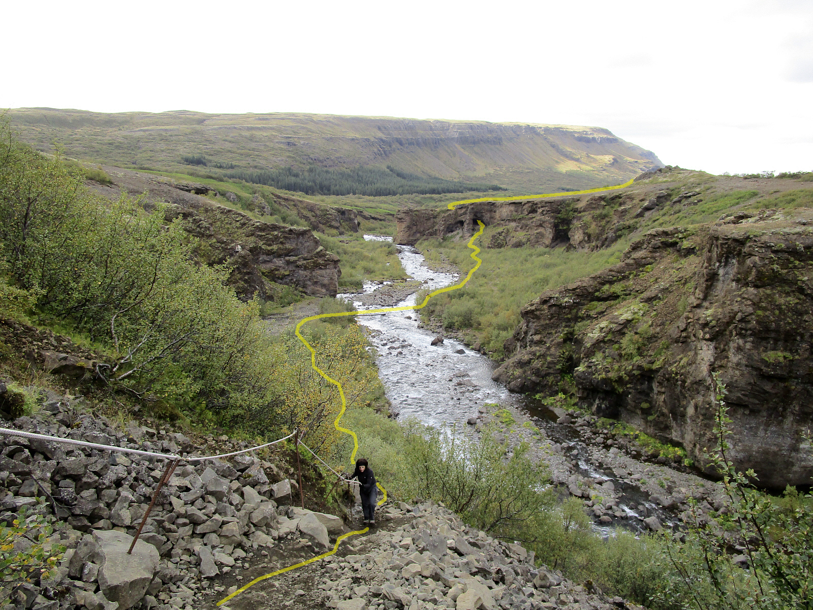 After passing through the cave and crossing the river, the trail rises steeply; but ropes are available where needed to help hikers. Looking back, I can see the trail traveled so far. Click the picture for help seeing the trail.