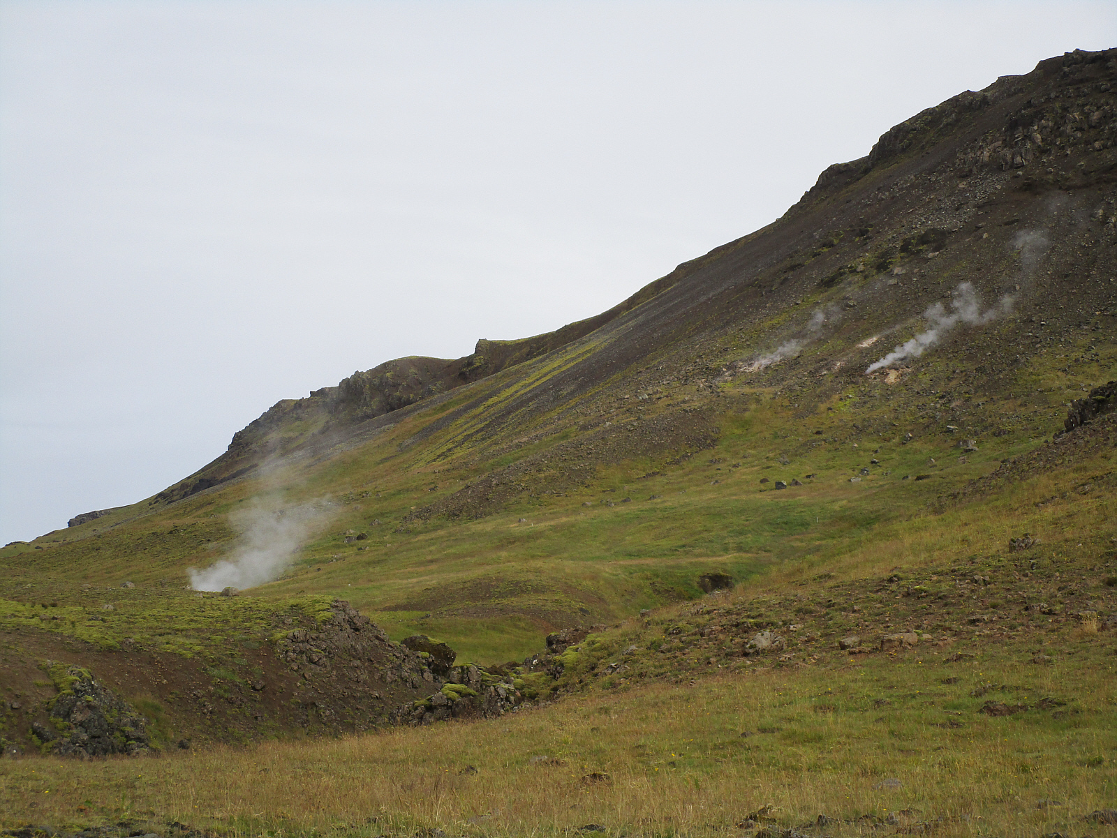 Steam pours out of holes all over the grounds, and small mud pools bubble near the path. However, it's not very scenic, and there are massive clouds of gnats swarming everywhere in this area -- so I don't stay long. I saw almost no other insects anywhere else -- but it seems like every flying bug in Iceland is concentrated right here. There's a horse path here too, and some riders are wearing mosquito netting over their heads. The insects don't seem to bite (much), but they are annoying (flying into eyes, ears, nose and mouth). Even the horses seemed unhappy.