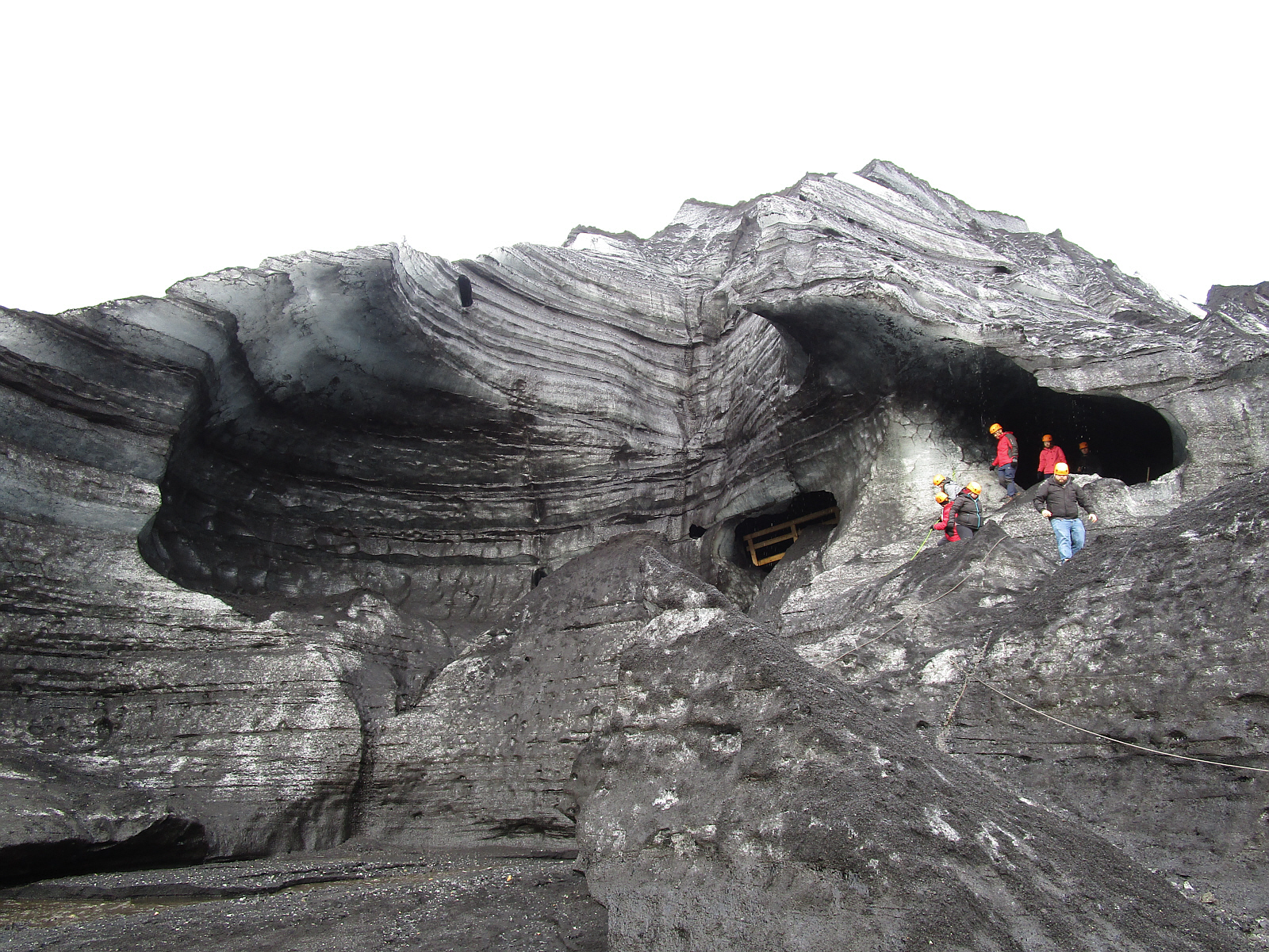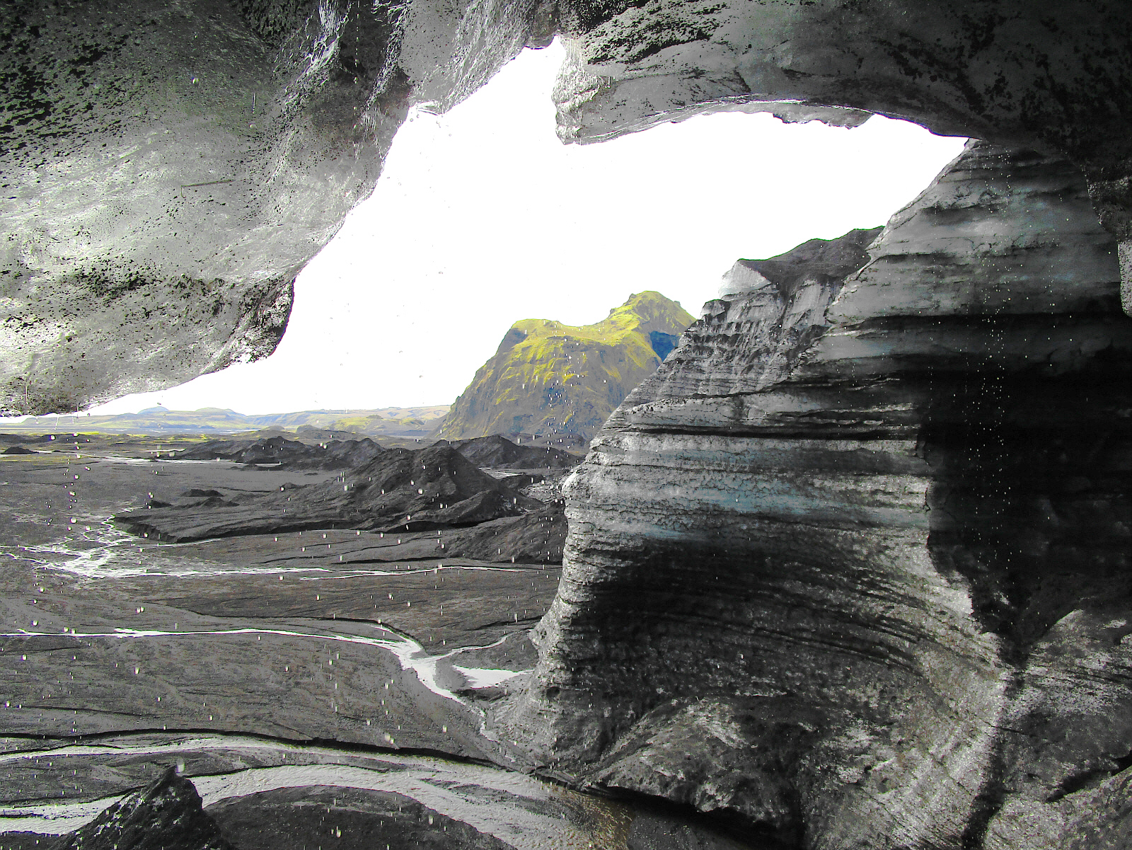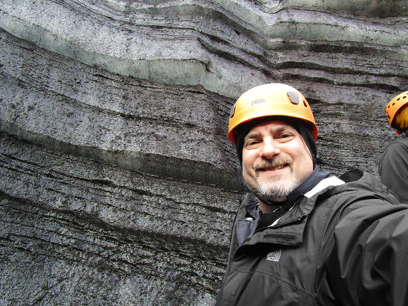 At the end of the cave, it opens up to an outside area and I take a quick self-portrait while wondering what keeps hitting me on the head. It's small rocks rolling off the top of the ice wall. Like all glaciers, this one picks up rocks as it moves along, and eventually these rocks melt through the ice or fall off -- in this case, 'beaning' visitors on the head every few minutes. So these helmets make a lot of sense -- and we're happy to have them.