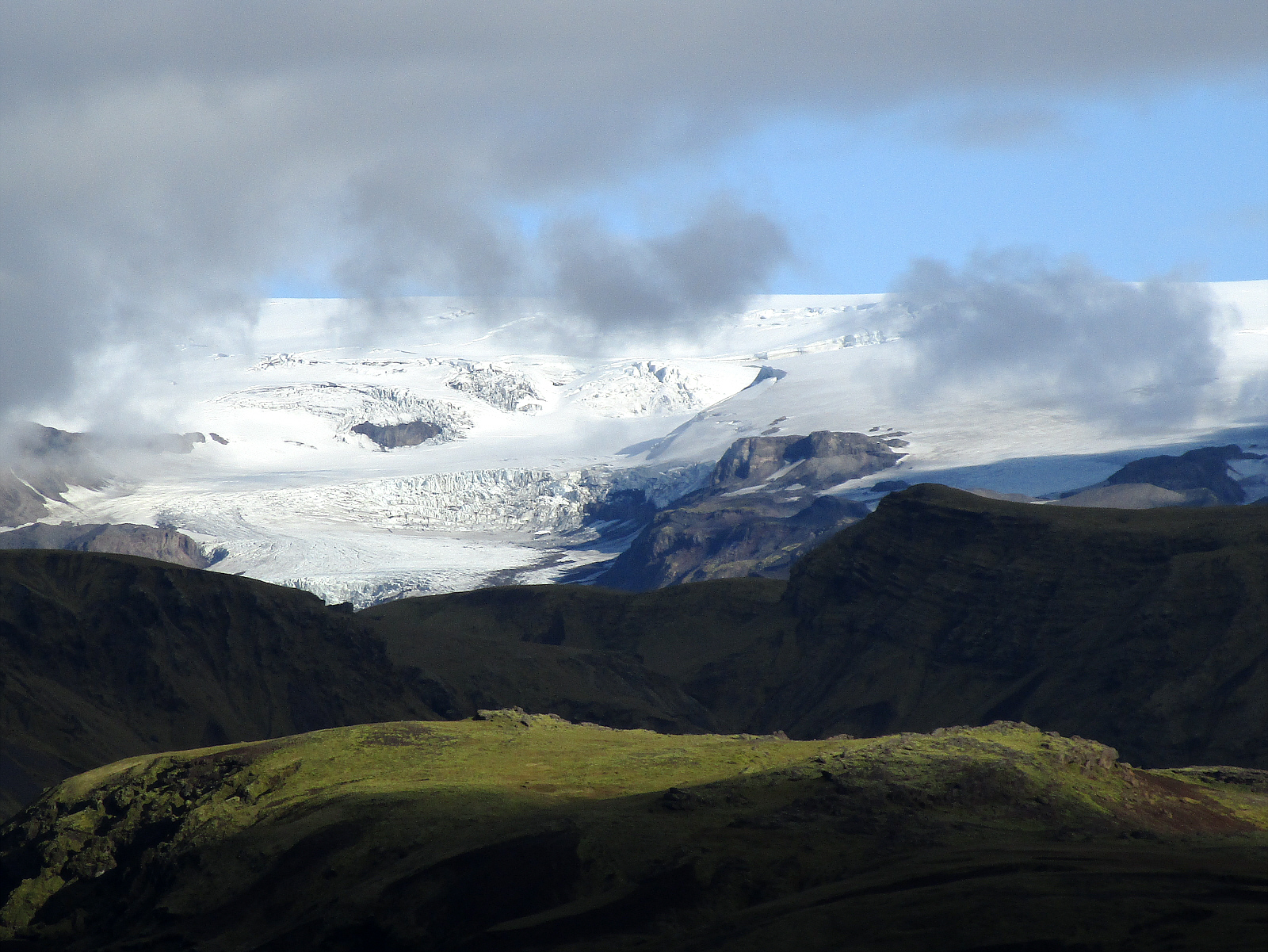 The next morning, driving several hours back to Reykjavik, and to see some of the sights skipped on the way down. In the distance are large glaciers -- just out of reach. Those may be part of Vatnajökull Glacier & National Park -- but it's a bit far to reach during this trip. Maybe an excursion for next time...