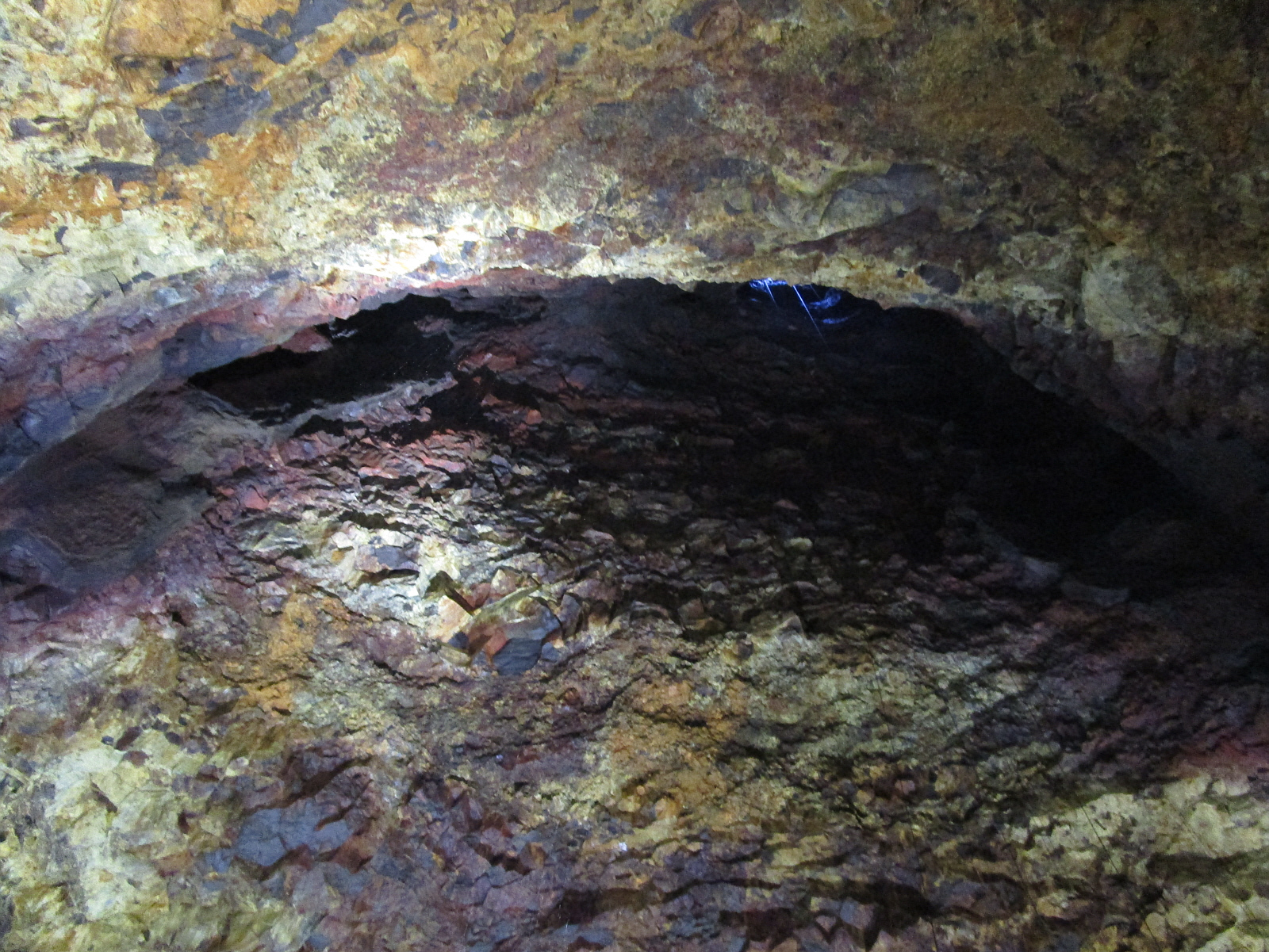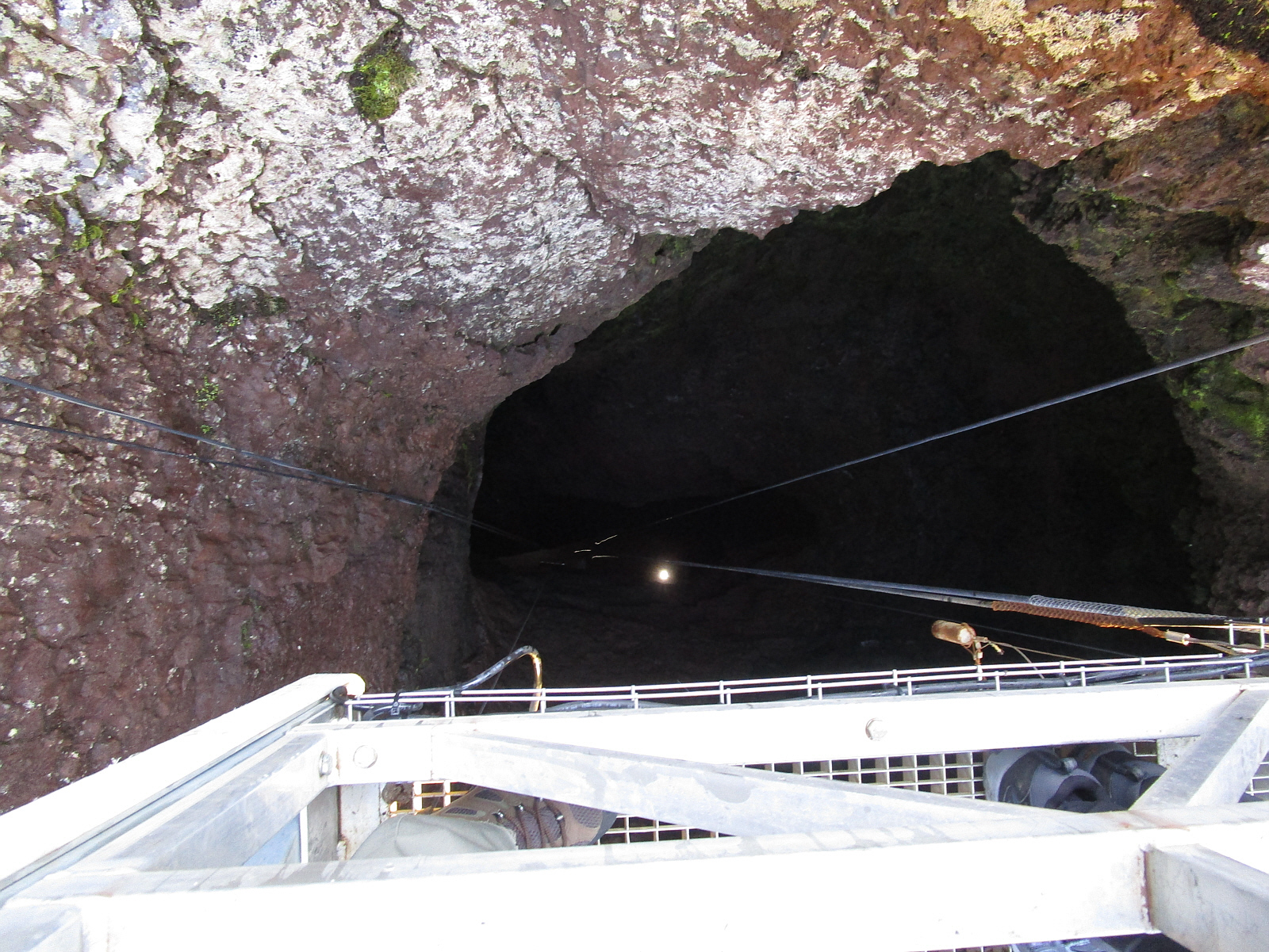 ![]() We step onto the 'elevator' (a modified window-washing rig), and look down into the hole as we begin a slow descent. The guide explains more about the geology of the volcano as we look at the layers in the walls. Apparently, this is the only dormant volcano in the world where you can go inside. Most of the time, the magma cools and hardens in place -- but for some reason, it drained out of this one while still liquid (about 4000 years ago), creating a cavern.