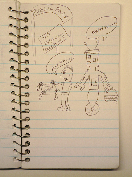 This is probably true everywhere these days -- but I noticed that a lot of the public parks have signs that say "No Drones", and it prompted me to draw this silly cartoon. |