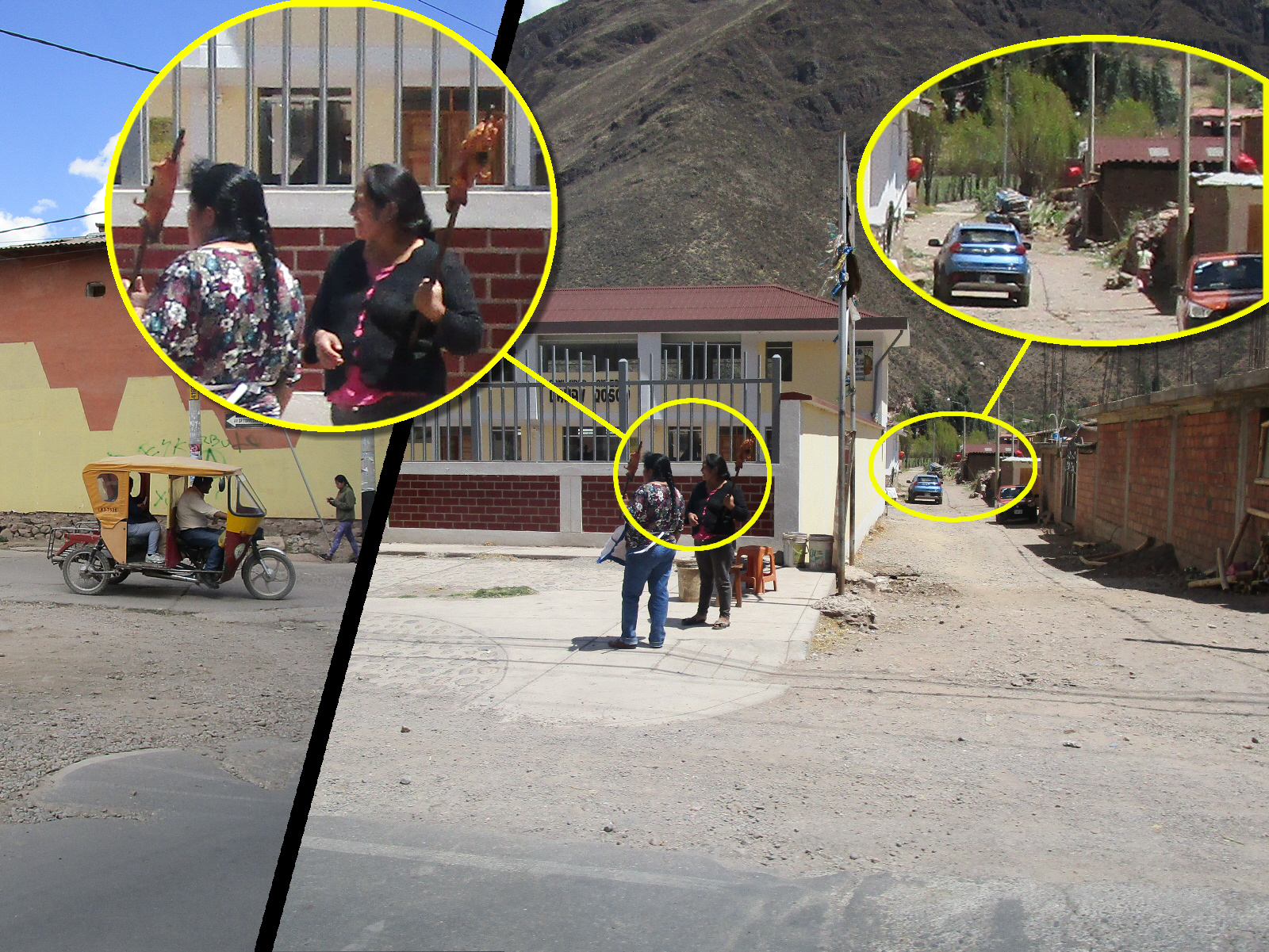 Driving through the small local towns, most people get around in Tuk Tuks -- a practical 3 wheel vehicle common here. These towns typically have a paved 'main' street with dirt roads for side streets. Locals sell roasted or fried guinea pigs on a stick on the street corners (a popular food here) -- and makeshift 'bars' called chicherias sell a traditional home brewed 'beer', often in the front room of someone's home. The houses selling the chicha beer are marked only by a broomstick with a red bag or balloon at the top (look down the side street, or click the picture for an enhanced view).