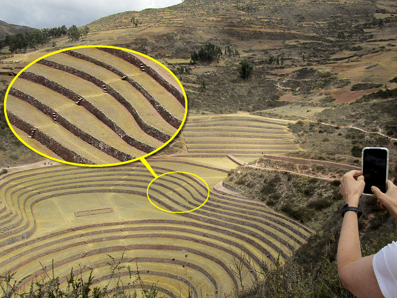 Visitors take pictures with their phones (I still use a camera because I care about quality); and we admire the careful and impressive construction. Like other terraces we've seen, there are long stones imbedded into the walls to act as 'stairs' at many locations; along with built-in drainage. <Click the photo for a closer view>