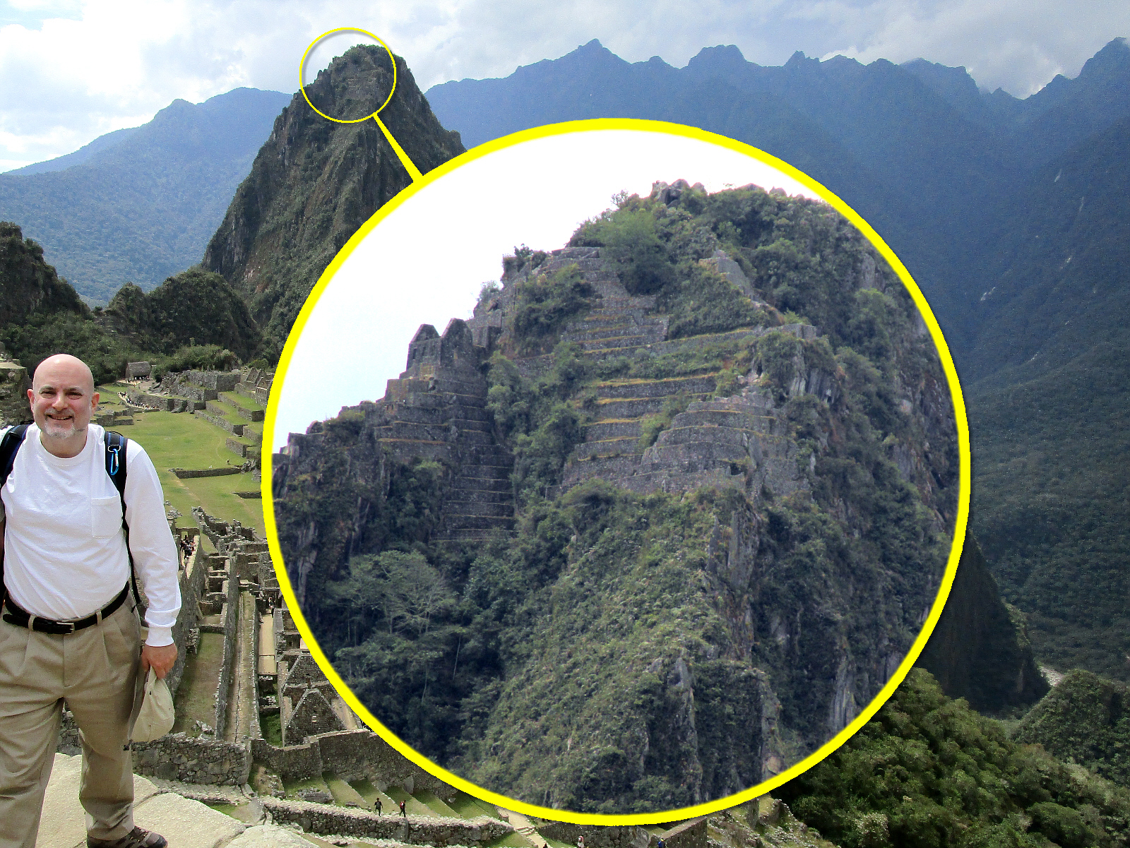 I hand my camera to Edwin and stand as close to the edge as comfortable (or maybe a bit closer) for this photo. The Inca never developed a written language (or the wheel), but their ability to shape the landscape was remarkable, and signs of their work are everywhere. Even at the highest peak behind me, you can see the remains of more buildings and terraces (click photo for help viewing).