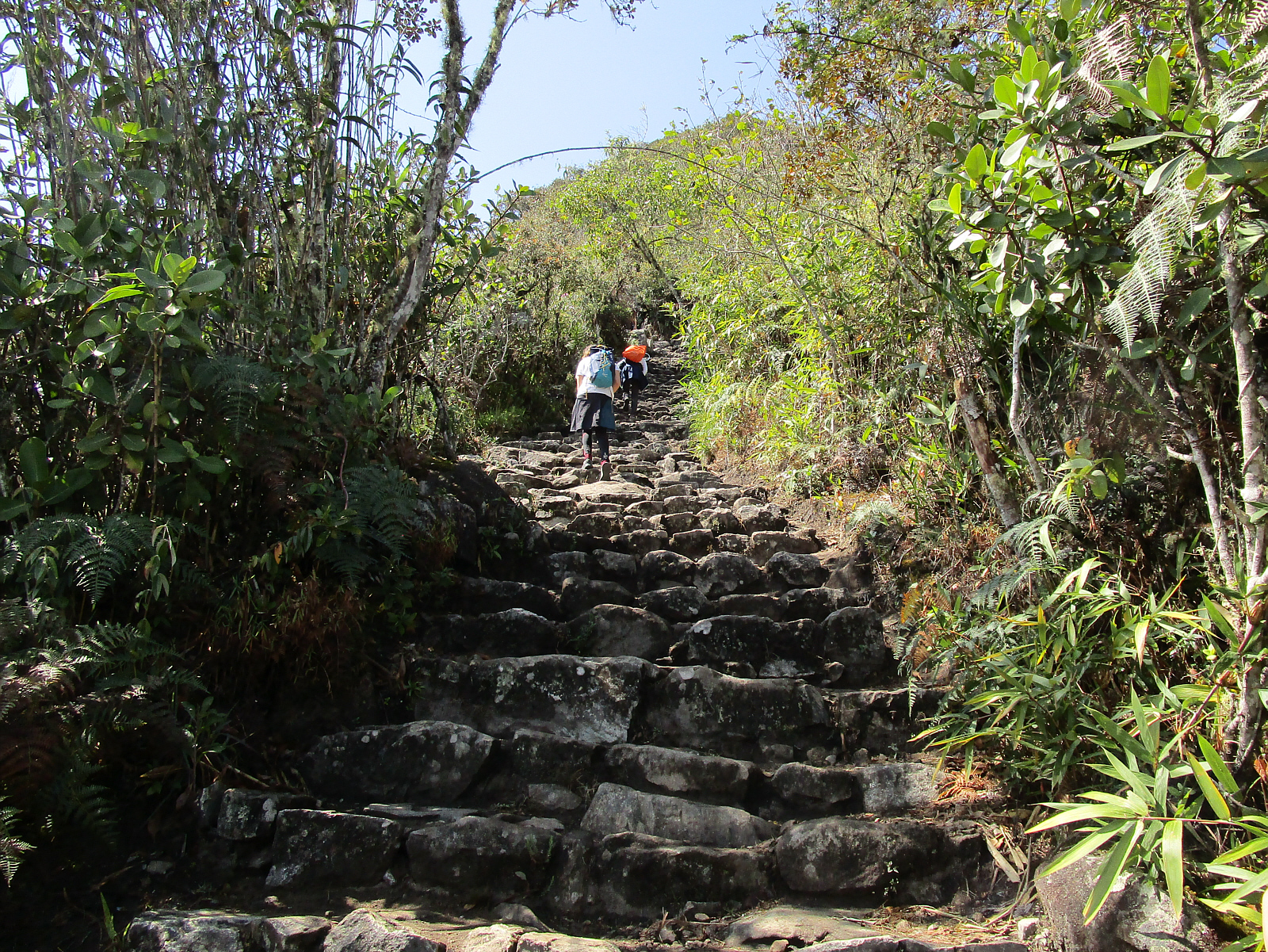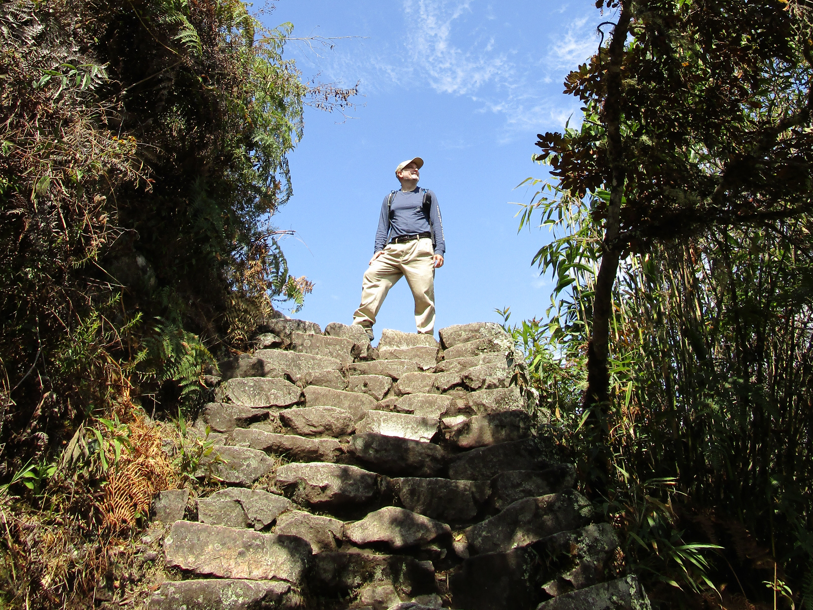 This path is all stairs -- and all up (about 1600+ steps I think), surrounded by lush vegetation. Just like other Inca architecture we've seen, these stairs are well constructed and probably several layers deep. The Inca had no cars, wheels or horses -- so they got everywhere on foot. The fact that this trail is so wide makes me think it was probably an important 'highway' for travel between villages.