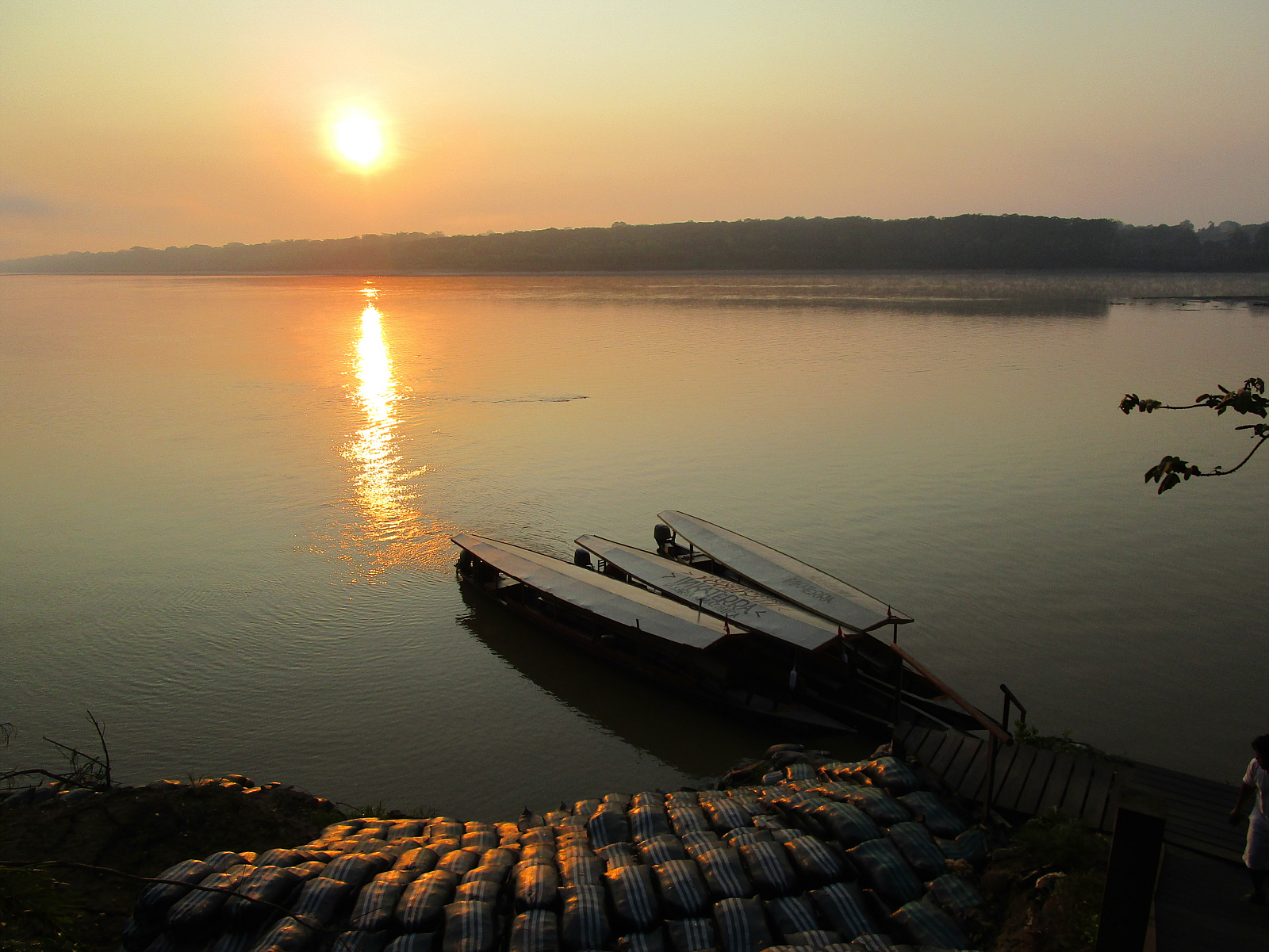 ![]() Saturday; Sept 14. The hotel staff provides a 'wakeup' call with a knock on the cabana screen door around 5:30am -- and boats leave at 6am sharp for the morning excursion. Animals here get up early -- and so must we if we want to see them. There are no roads here -- the river is the only way to get around as we depart on this hot, hazy morning. Other boats motor up and down the river; some from other lodges, along with smaller fishing boats and commuters. We're told there are also illegal gold miners and poachers here, and the hotel (along with others) is trying hard to reduce that (but with vast areas of land and minimal law enforcement, it's difficult). |