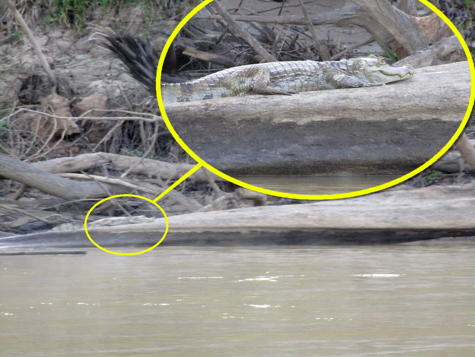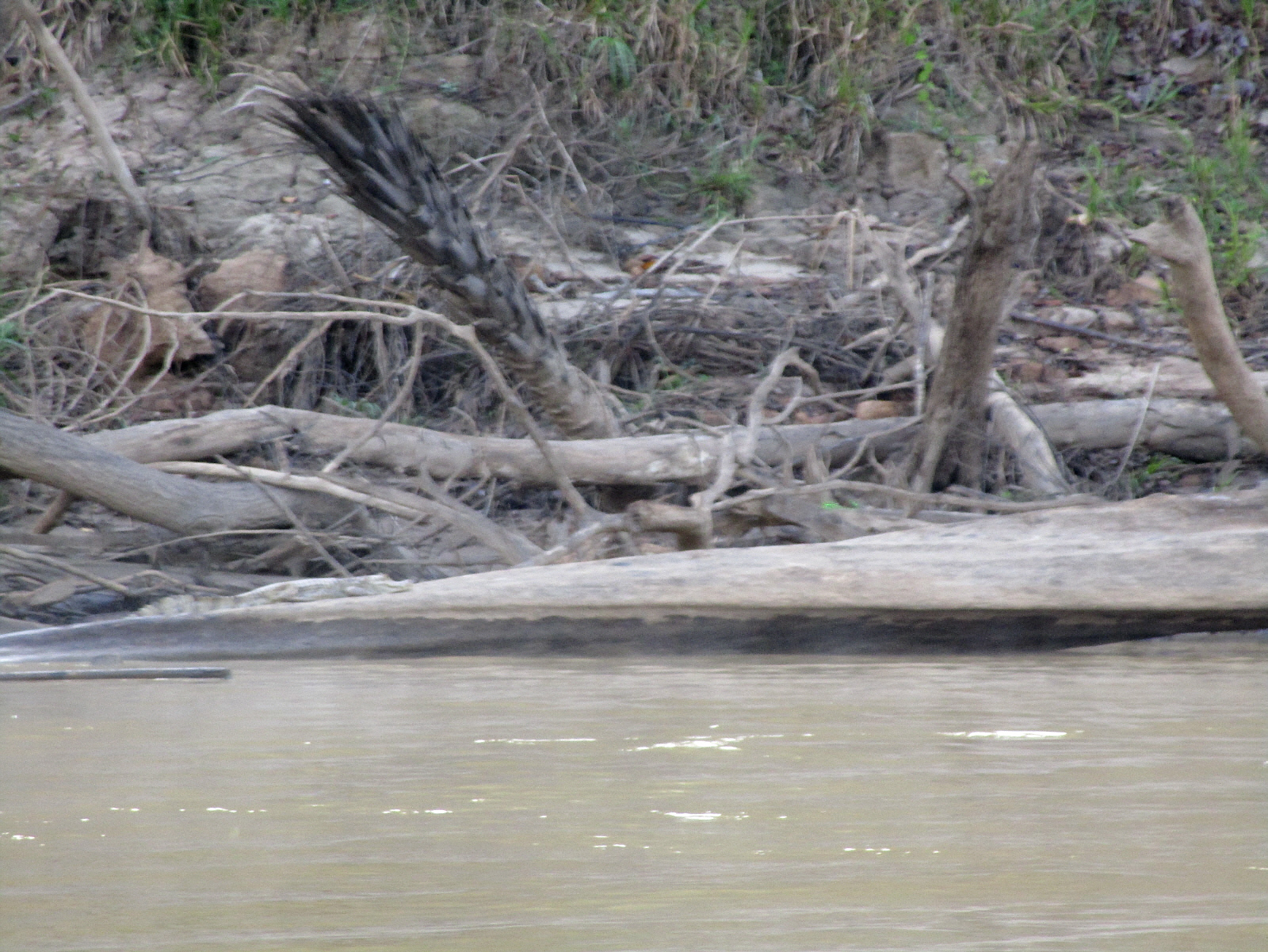Our long motor boat is operated by a captain, and typically 1 or 2 other staff members from the lodge that act as 'spotters' -- helping us see animals along the shoreline as we speed by. These animals are sometimes well camouflaged, like this large caiman, and we would easily miss them without the sharp eyes of our spotters. See him? Click photo if you need help.