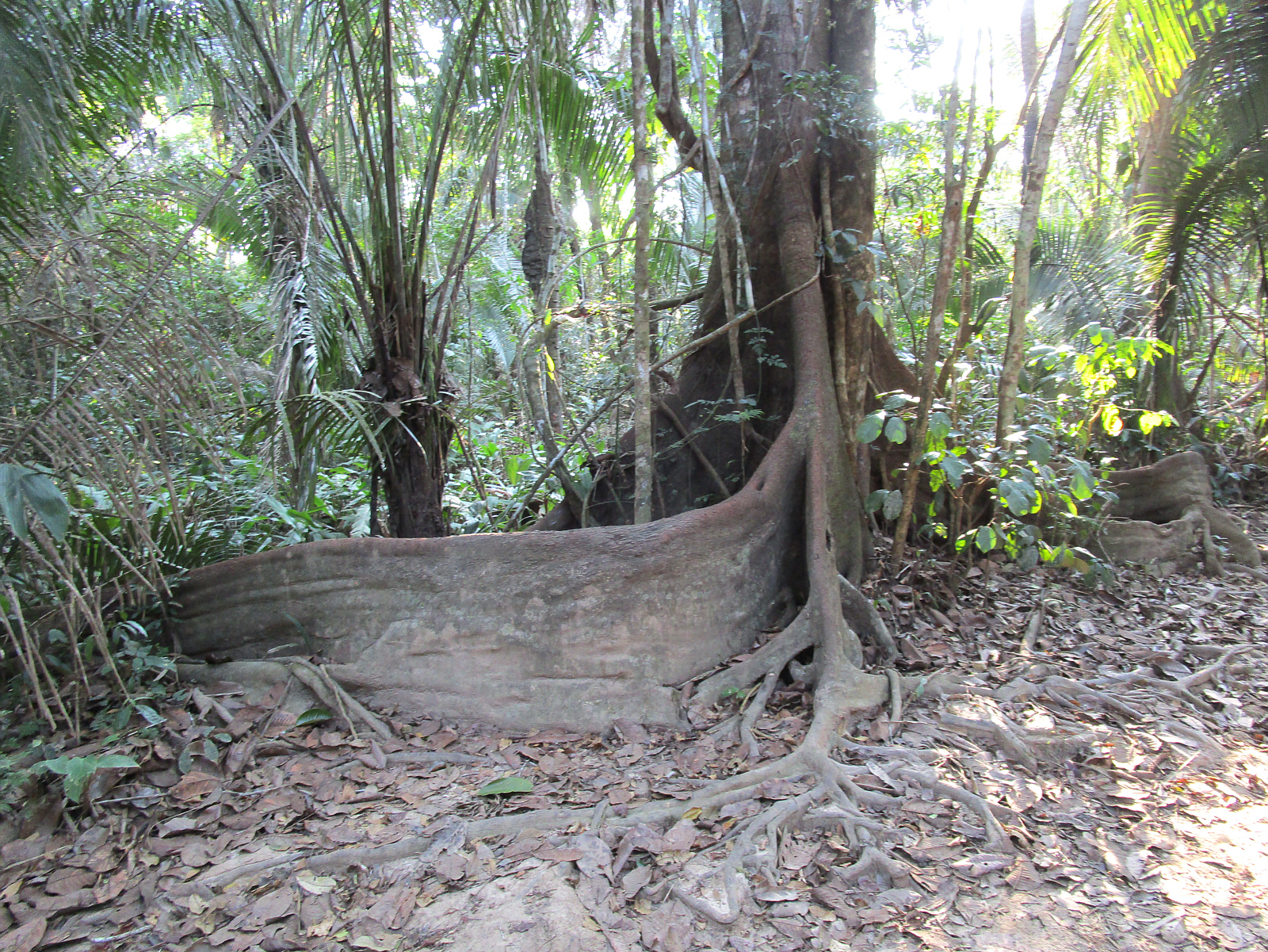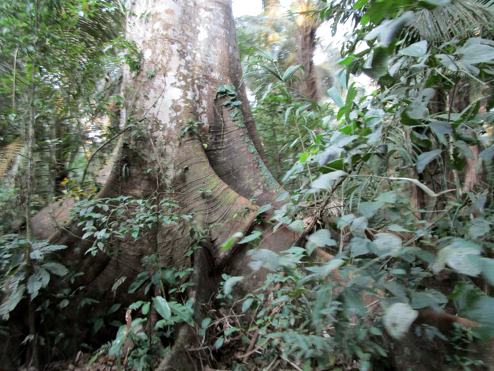 Giant trees need giant roots for support, and some of the larger trees have these 'buttress' style roots -- maybe an adaptation for areas with shallow soil or prone to flooding.