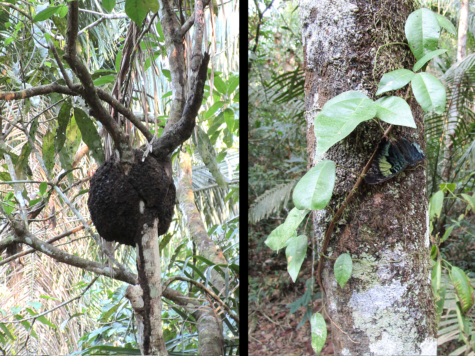 Plants and animals exist (and coexist) in abundance here, including a butterfly hiding on a tree trunk, and a large termite nest high in a tree. Termites are a nuisance in your house, but they're beneficial in the rainforest, providing food for many animals, insects and birds -- as well as clearing dead wood and leaves from the forest floor.