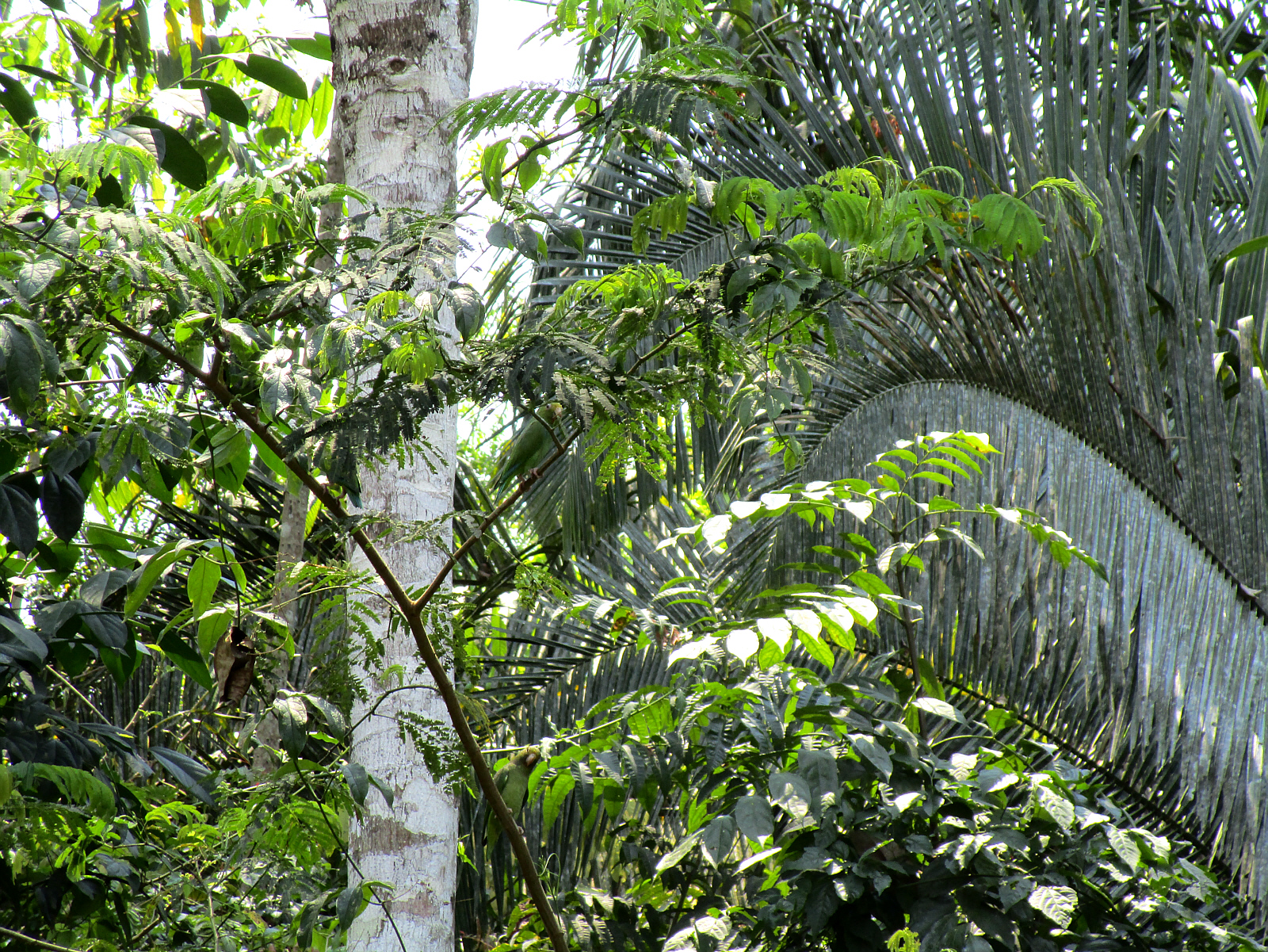 It's hard to see much in the dense foliage; but the sound of hundreds of birds singing in the bushes just outside the cabana echos through the site. Walking anywhere near them to get a better look causes the entire invisible flock to immediately take off -- revealing bright blue & green parrots. But when they're perched -- only their outer green feathers show; making them hard to spot. See them? How many parrots can you find?