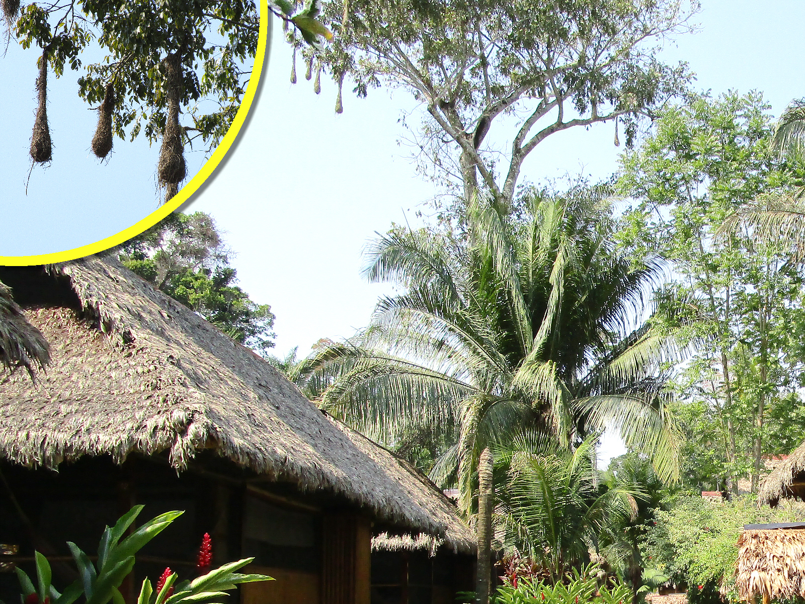 Returning to the lodge between the morning and afternoon excursions provides a break from the mid-day jungle heat. Interesting 'woven' bird nests can be seen hanging from most of the taller trees around the hotel grounds (see inset).